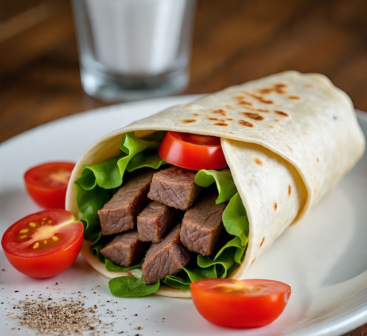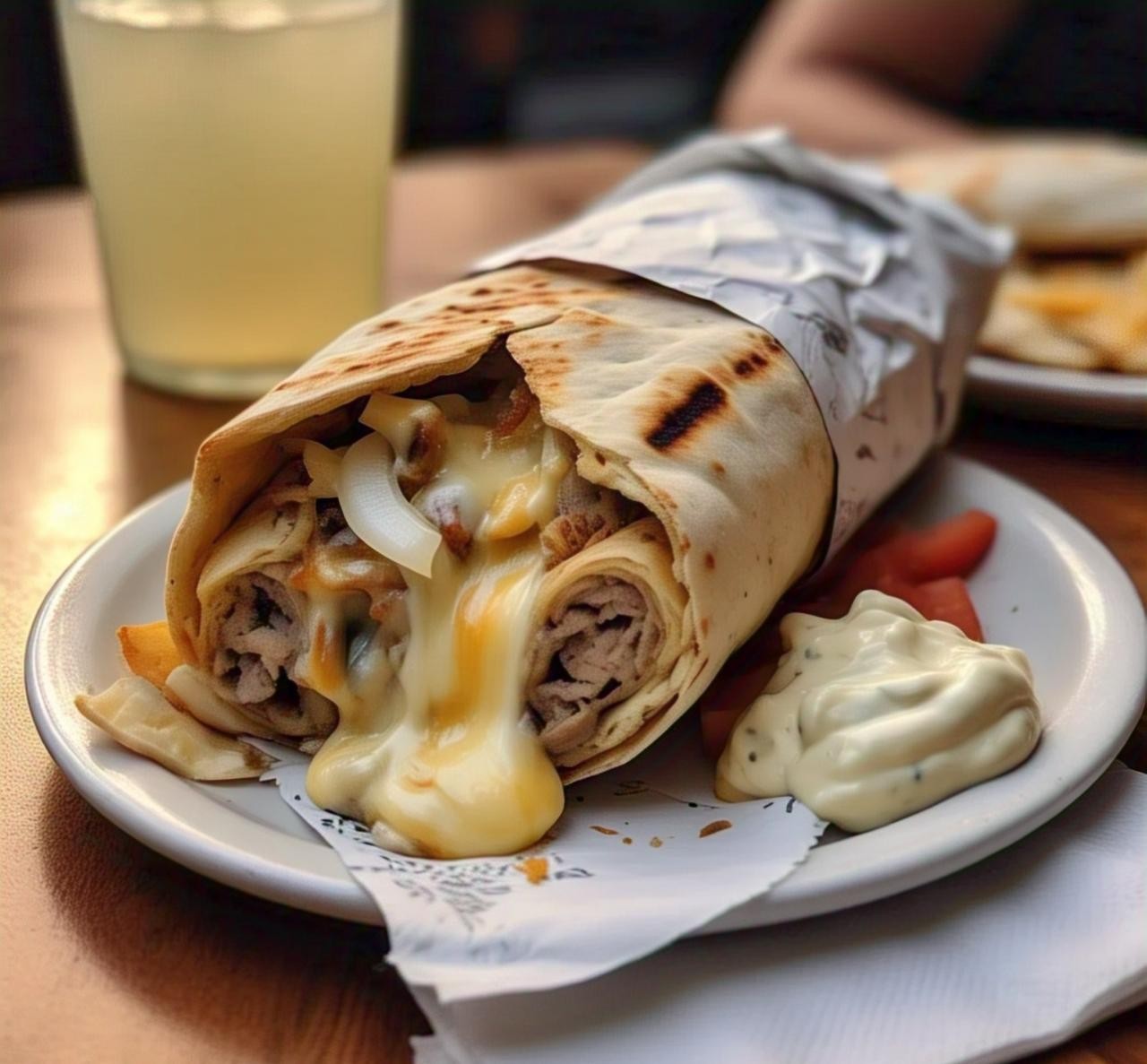 Deliciosos panes de pita de 27 cm, rellenos con troceado de cebollín chino y tomate, con carne de res molida y pico de gallo y nuestra deliciosa salsa de ajo cremosa.