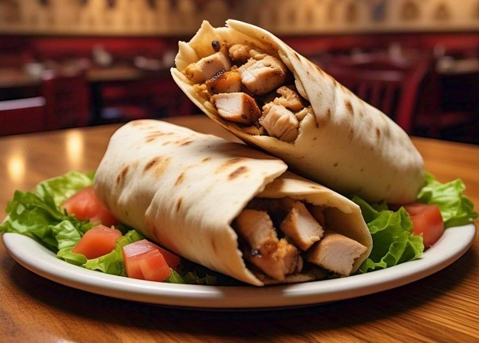 Deliciosos panes de pita de 27 cm, rellenos con troceado de cebollín chino y tomate, con trozos de pechuga, cerdo y lomito de res salteados en nuestra deliciosa salsa de ajo cremosa.