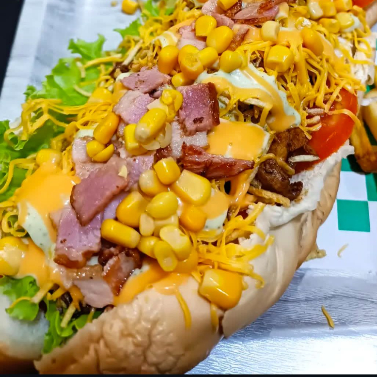 Dos panes bagues tostados a la parrilla Acompañados de pollo al grill, lechuga tomate, cebolla, Chongo, maíz, queso amarillo, tocineta crujiente, y nuestras deliciosas salsa de la casa
