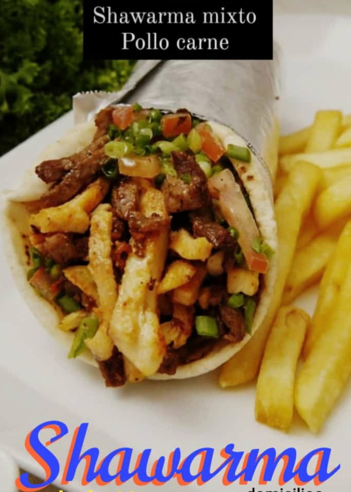 Shawarma de Trifásico ( carne de res, pollo y lomo de cerdo) + Papas a la Francesa ( 150 gramos) salsa de ajo y tartara