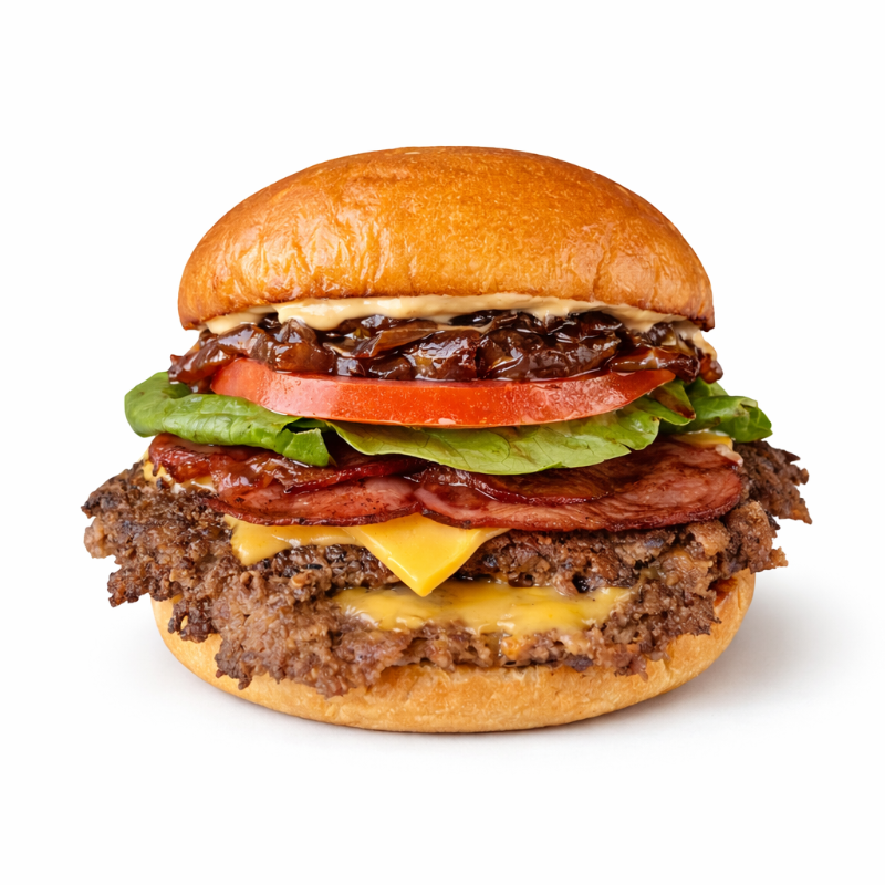 Pan suave, 2 carnes de res 90 g, doble queso americano, tocineta, cebolla crunch y salsa BBQ de la casa.