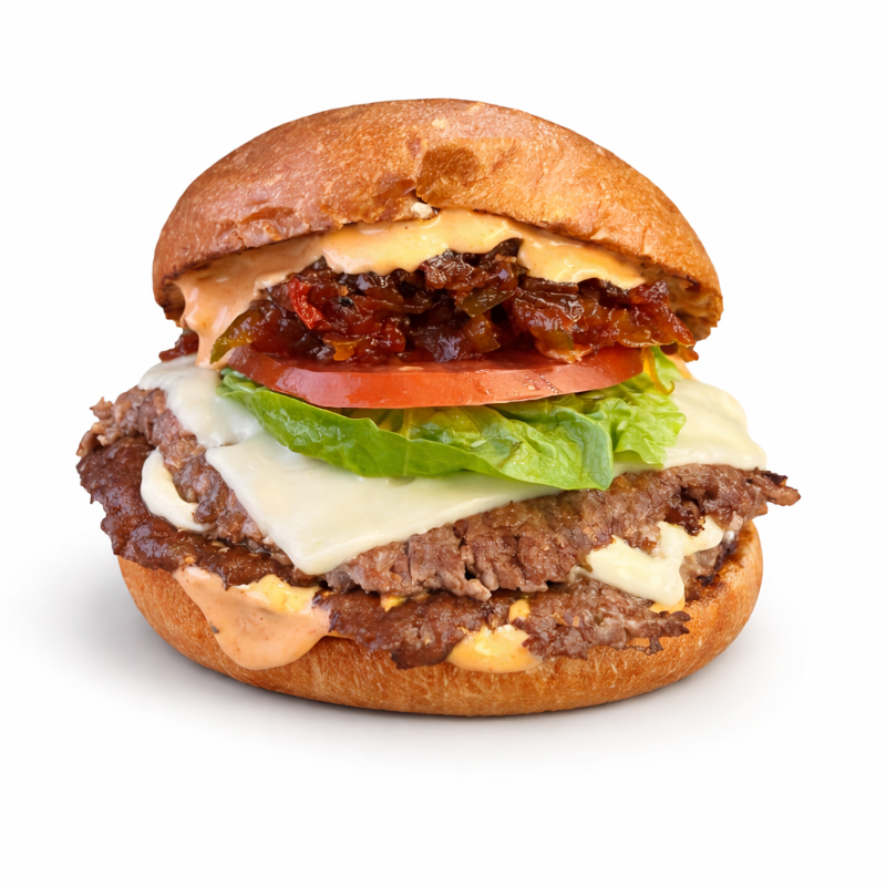 2 Carnes de res 90 g, mozzarella, tomate, lechuga, mermelada de tocineta y pimentón, salsa SML.