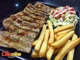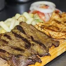 Carne y pechuga asada, papas francesas, ensalada y bebida.