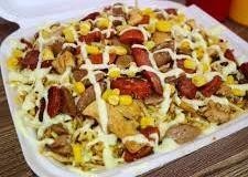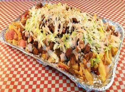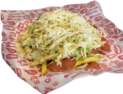 Papas francesas, chorizo, butifarra, maiz, tocineta chongo, lechuga, queso mozzarella. Para 2 personas aproximadamente.