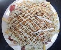 1 Salchipapa con queso mozzarella más 1 perro gratinado.