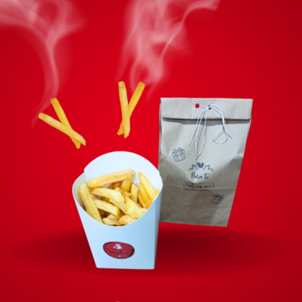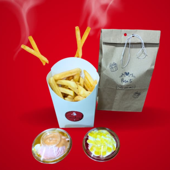 "Disfruta de una porción de papas fritas crujientes, acompañadas de un dulce final a tu elección: crema Chantilly o helado. Personaliza tu experiencia añadiendo dos salsas a tu gusto."