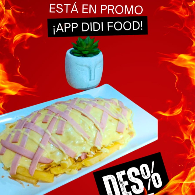 La combinación perfecta que nunca falla. Una generosa base de papas fritas crocantes, trozos de salchicha de primera,queso mozzarrella fundido y jamon ahumado queso costeño rallado (¡con ese toque saladito que tanto te gusta!), lechuga fresca y nuestras salsas de la casa. ¡El sabor de siempre, como debe ser!"