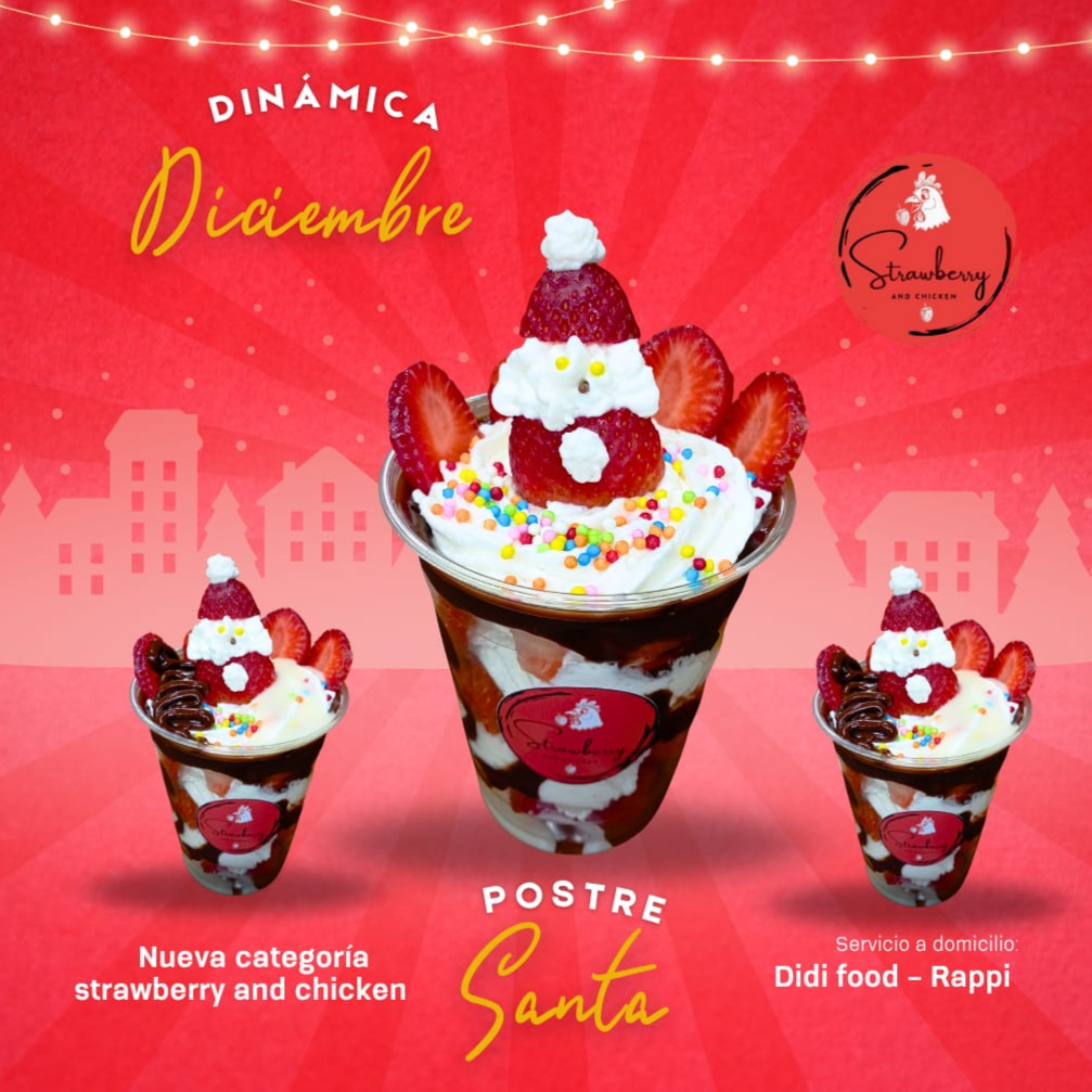 Nuestro clásico y cremoso postre de fresas frescas con una dulce crema batida, delicadamente decorado con una fresa en forma de mini Santa Claus que le da el toque mágico de la Navidad.