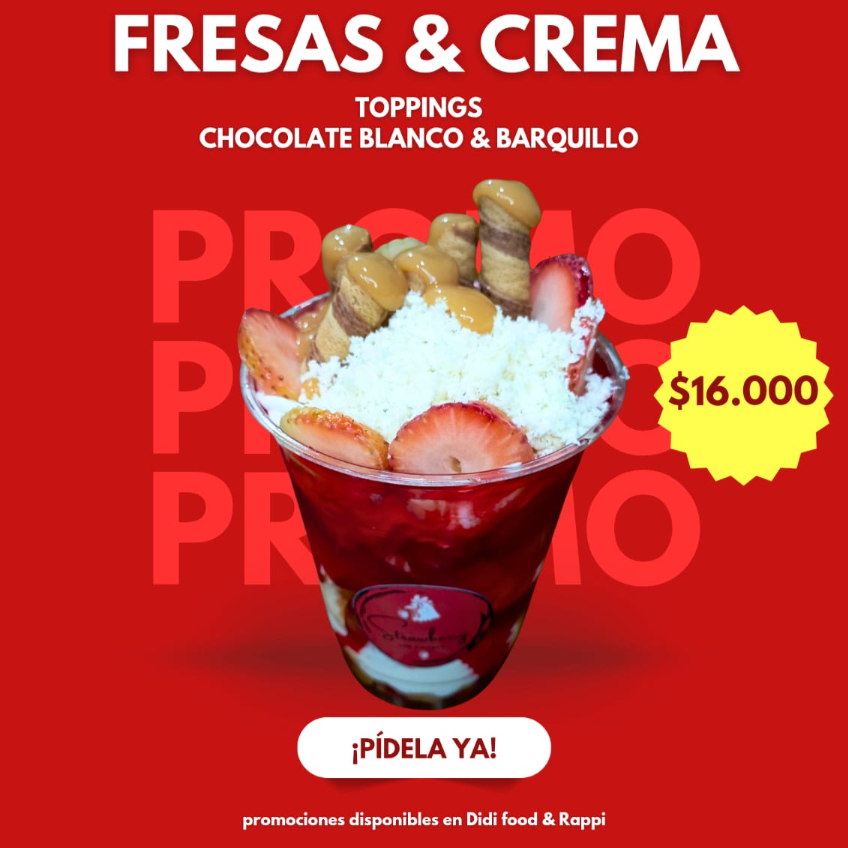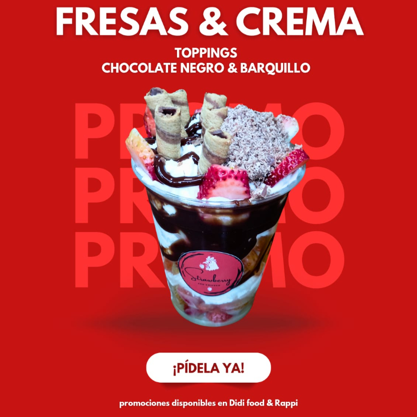 Postre Fresas con Crema: La Dulzura Clásica que Enamora 💖🍓 ¡Sumérgete en la simplicidad deliciosa de un clásico reinventado! ✨ Nuestro Postre Fresas con Crema es una obra de arte de sabor. 🎨 Disfruta de la frescura inigualable de nuestras selectas fresas🍓, generosamente acompañadas por la suavidad y ligereza del chantilly cremoso. ☁️ Dale el toque final con tu elección de exquisitas salsas 🍫