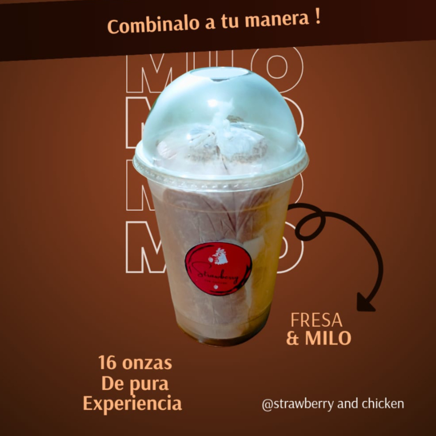"Fresa-Milo: El Dúo Perfecto. Un batido cremoso de fresas frescas endulzado con el toque único y achocolatado de Milo. Disfruta de una explosión de sabor, energía y nostalgia en cada sorbo de este tamaño de 16 onzas."