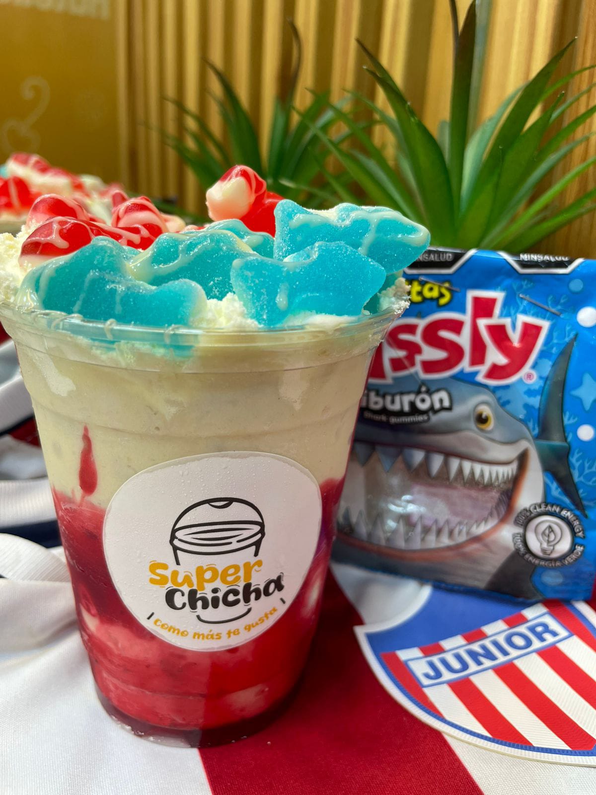 Chicha cremosa con gomitas de tiburon, salsa de frutos rojos y cereza. con leche en polvo