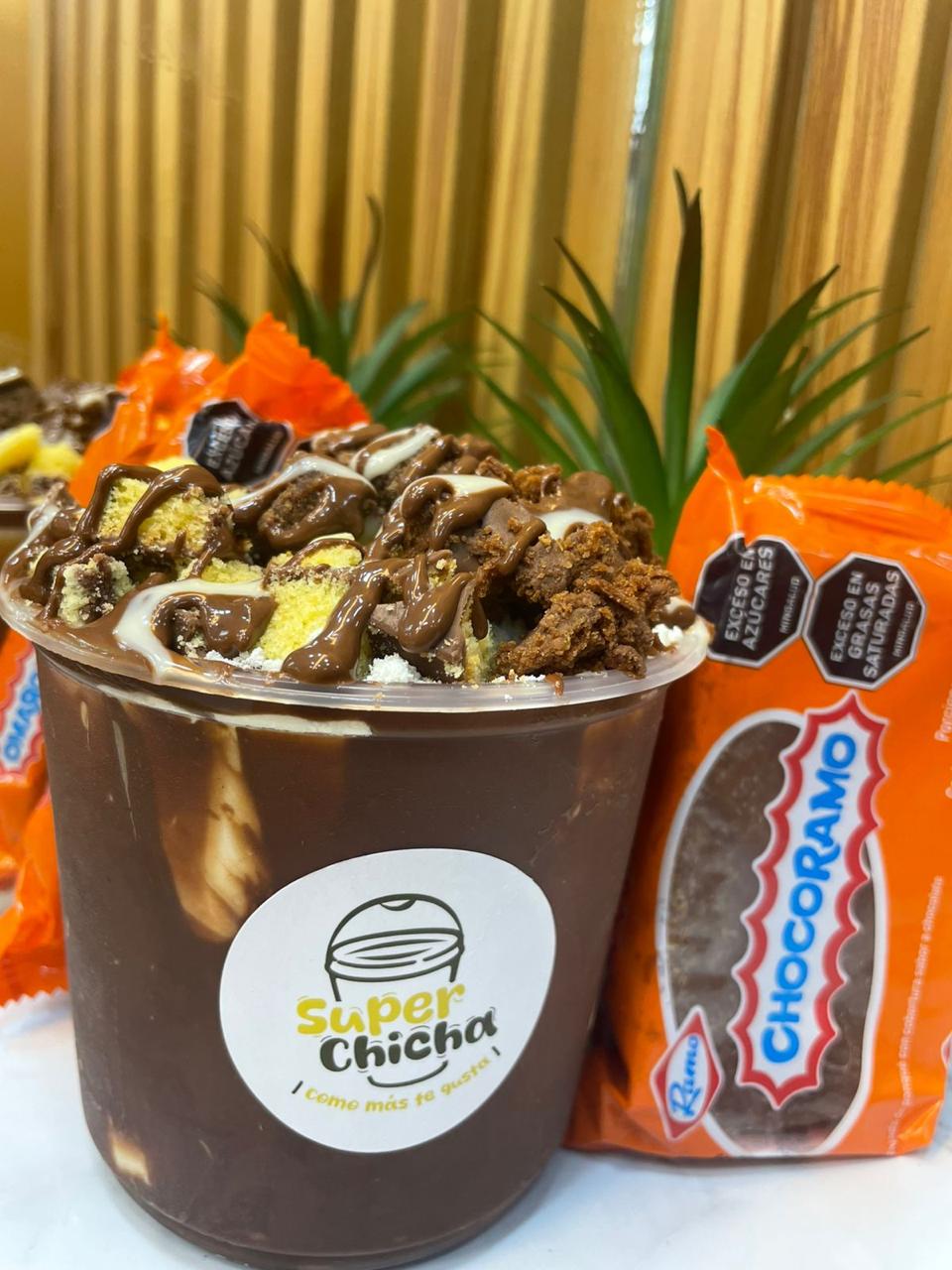 Chicha cremosa con Chocoramo, leche en polvo y salsa de chocolate, tamaño a elegir.