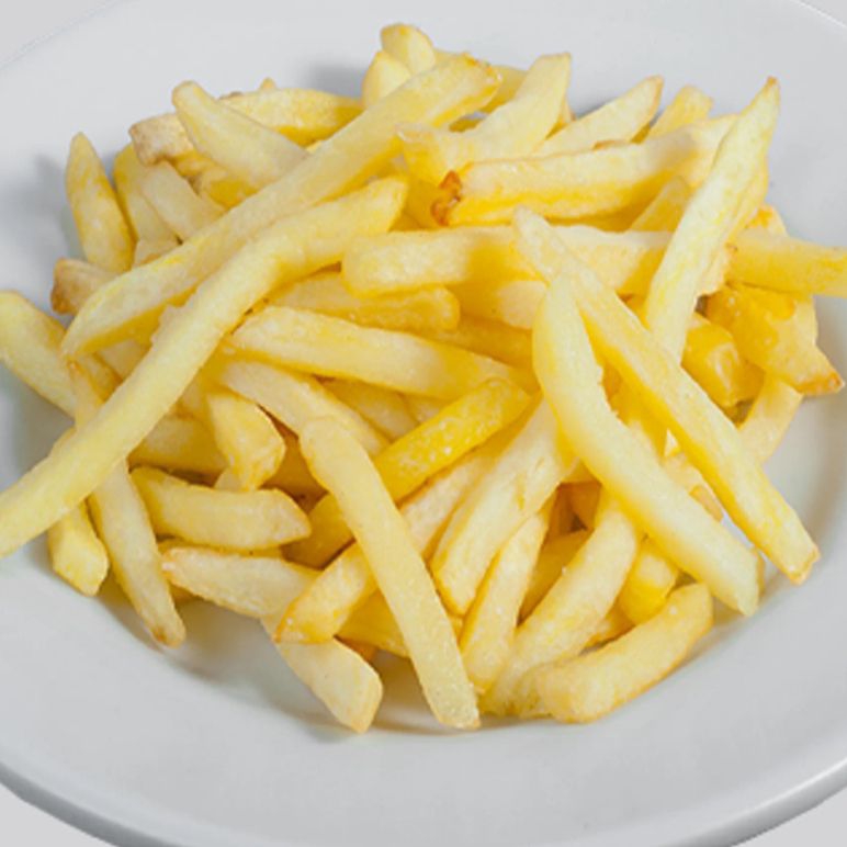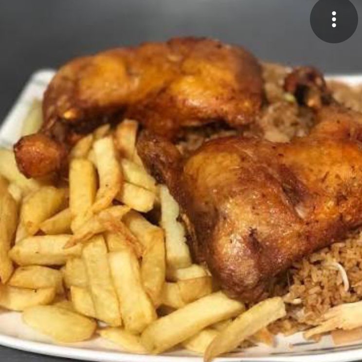 Plato combinado que incluye arroz, pollo y papas fritas.