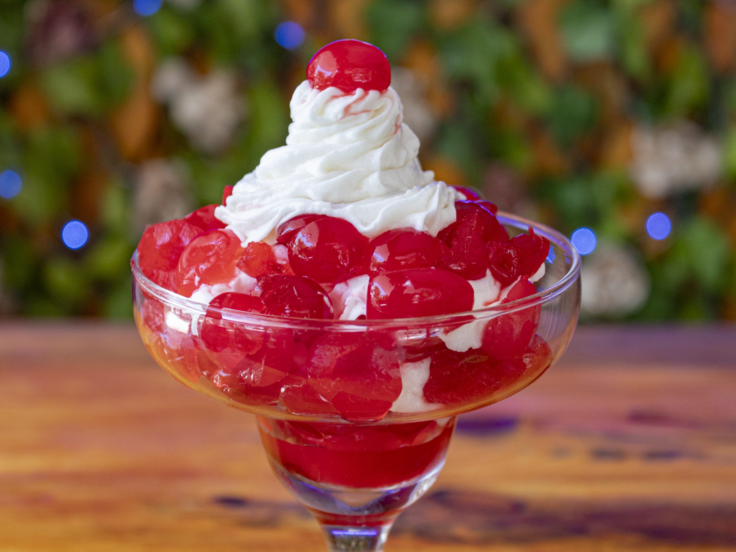 Fresas cortadas , mas crema de la casa , cerezas y salsa favorita.