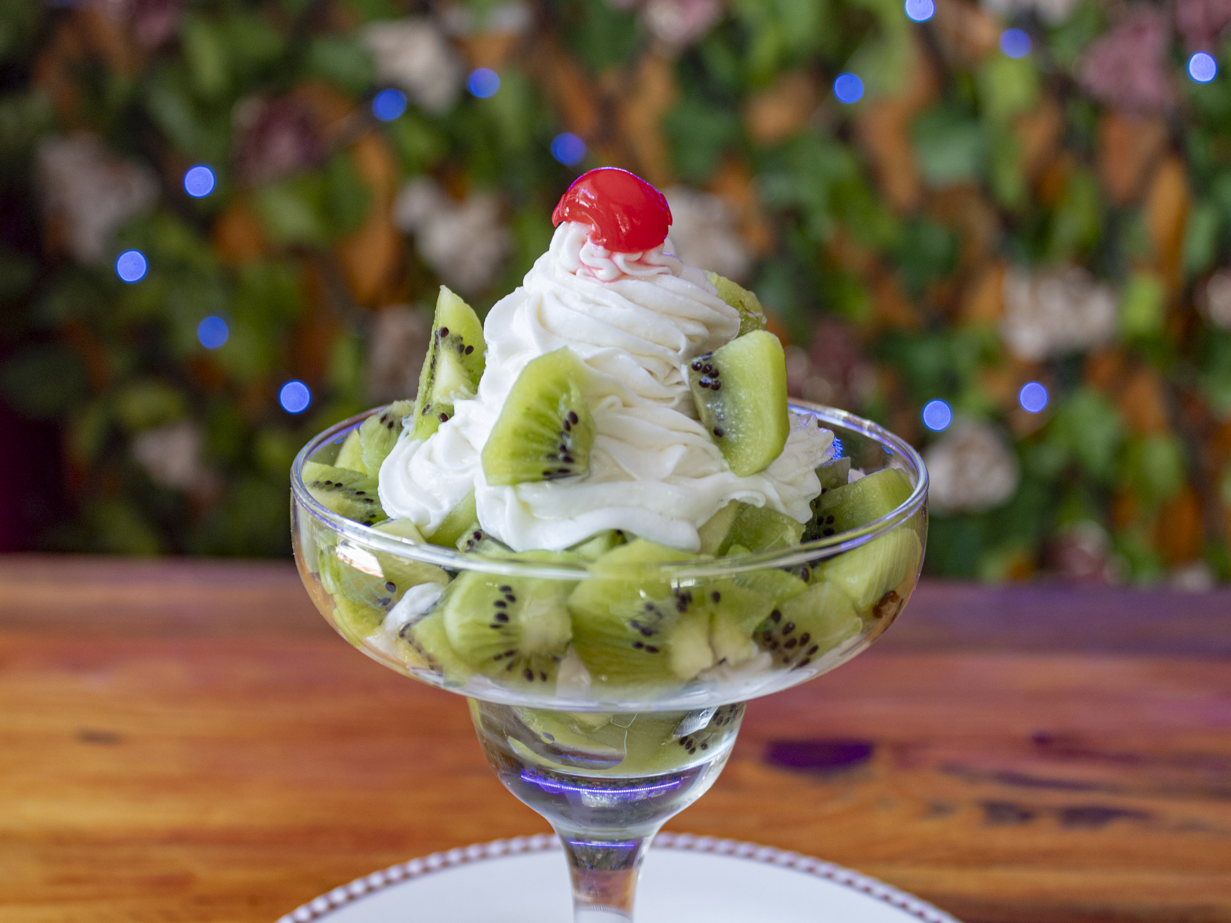 Arequipe fundido, queso bajo en sal, kiwi, manzana roja, arandanos y helado