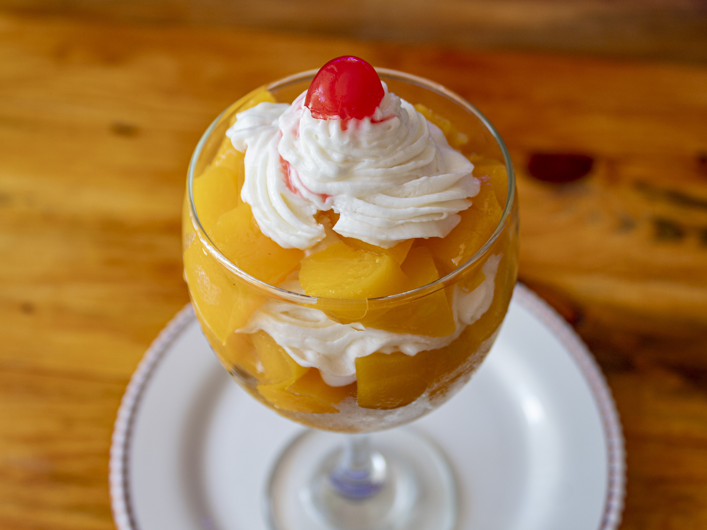Arequipe fundido, duraznos, cerezas, fresas, crema de leche helado
