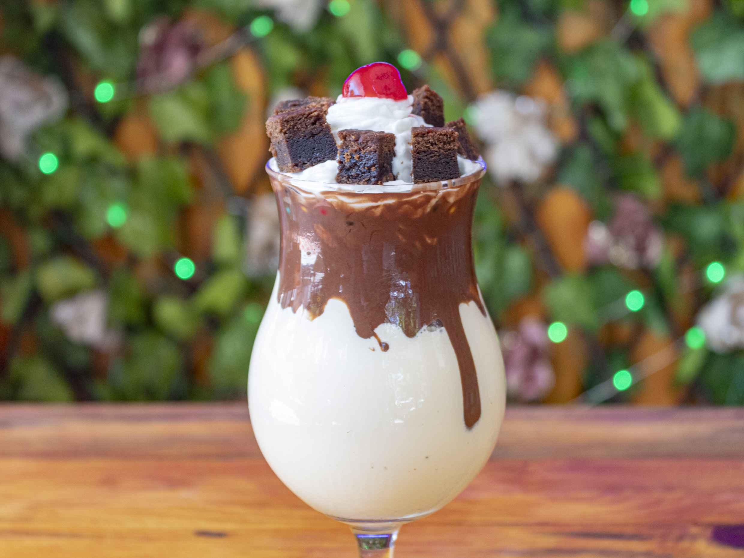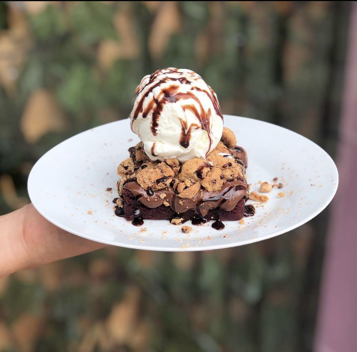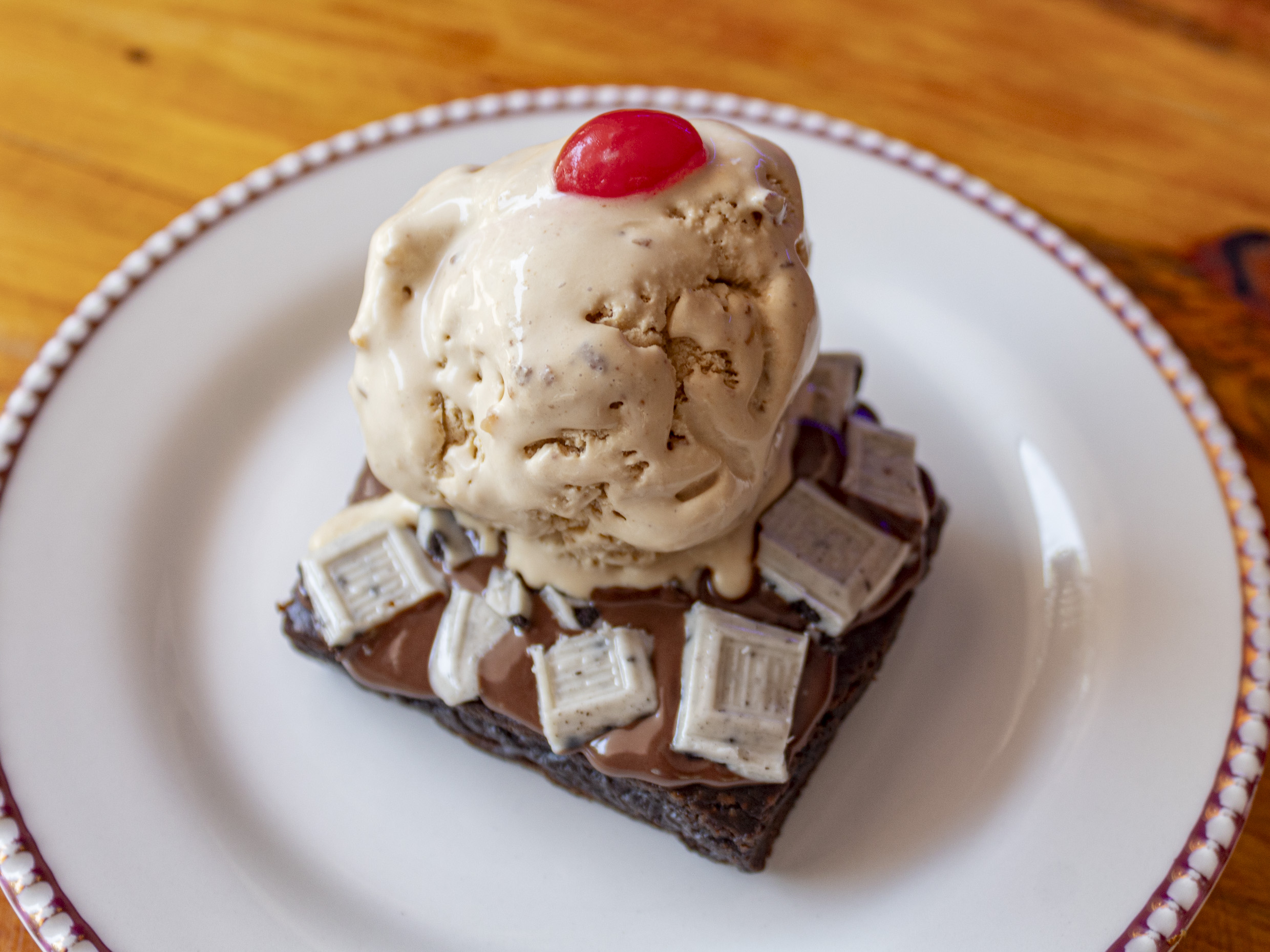 2 bolas de helado, brownie, crema de la casa, cereza, salsa hershey