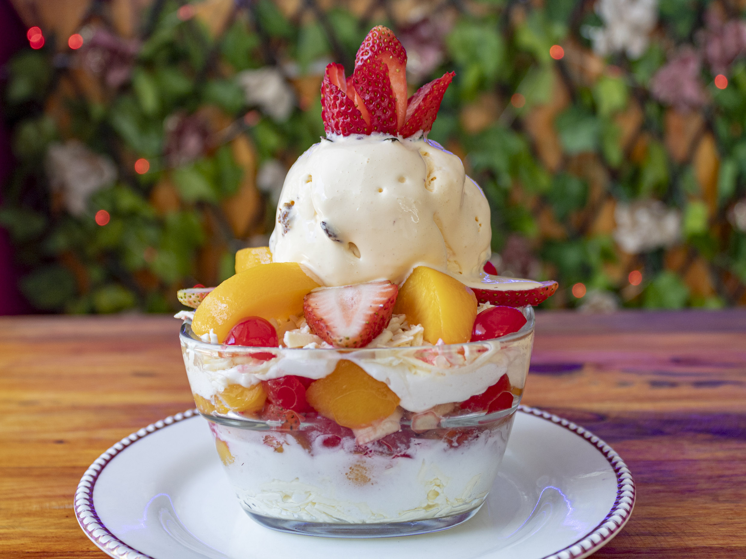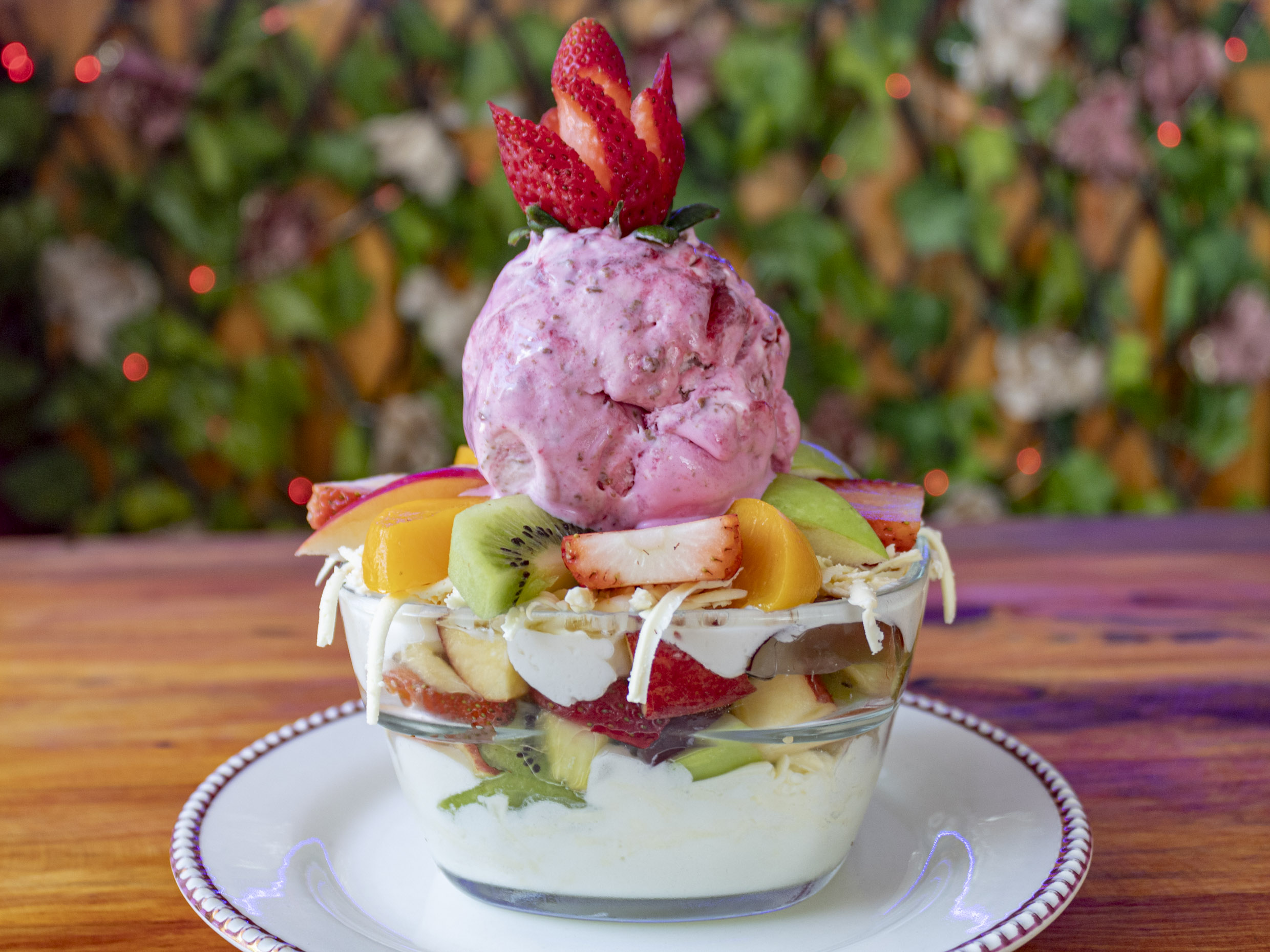 Fresas, durazno, banano, cerezas, crema de la casa , helado y queso bajo en sal