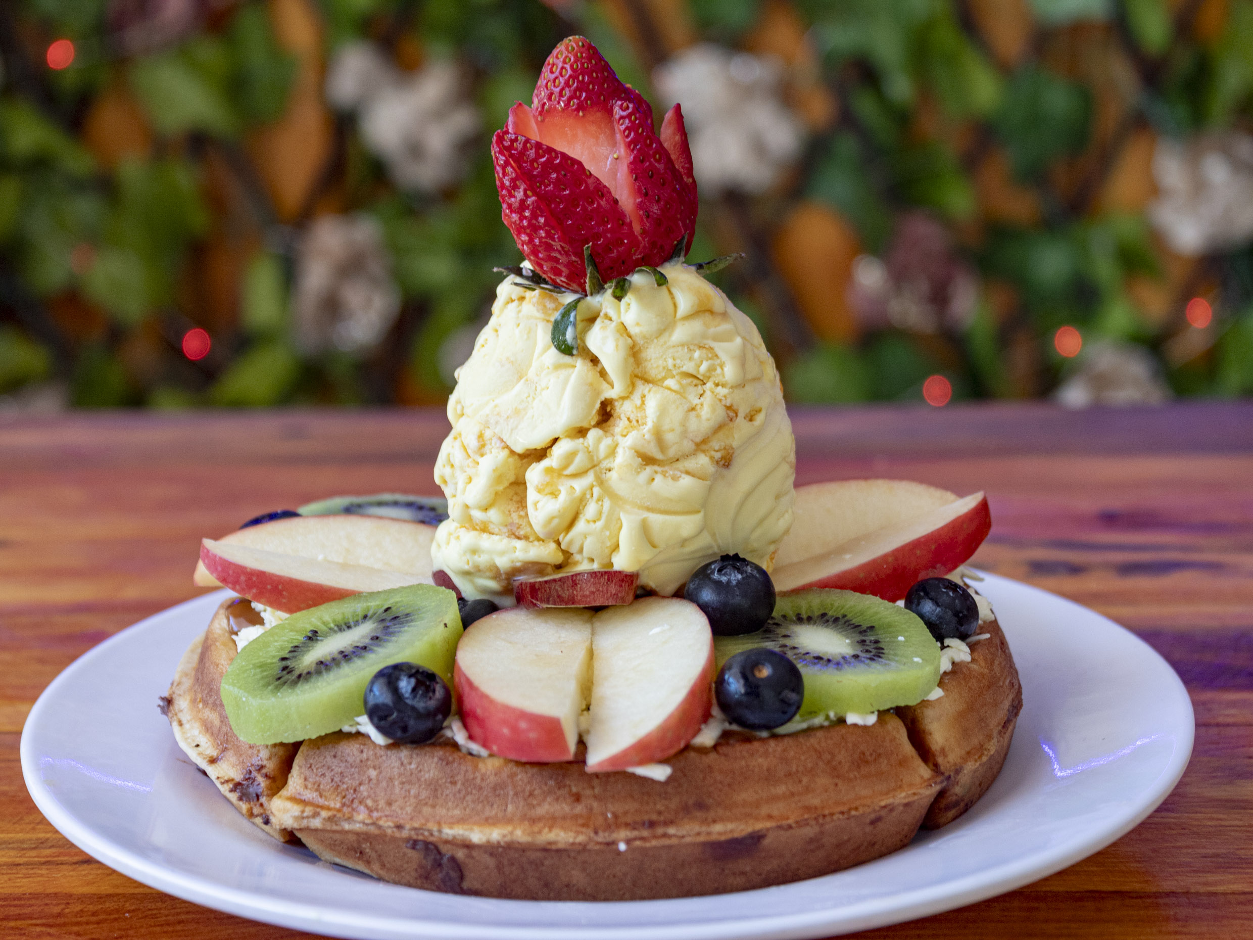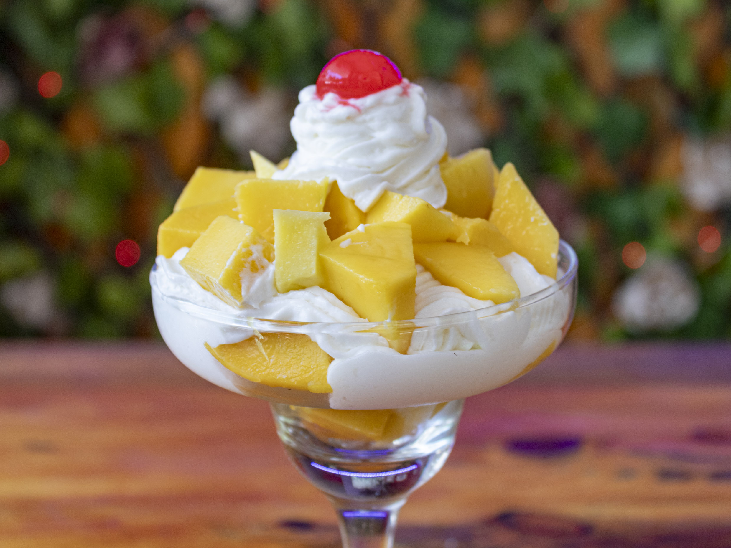 Banano, papaya, melon, piña, mango, brevas, queso bajo en sal, crema de la casa + 1 bola de helado