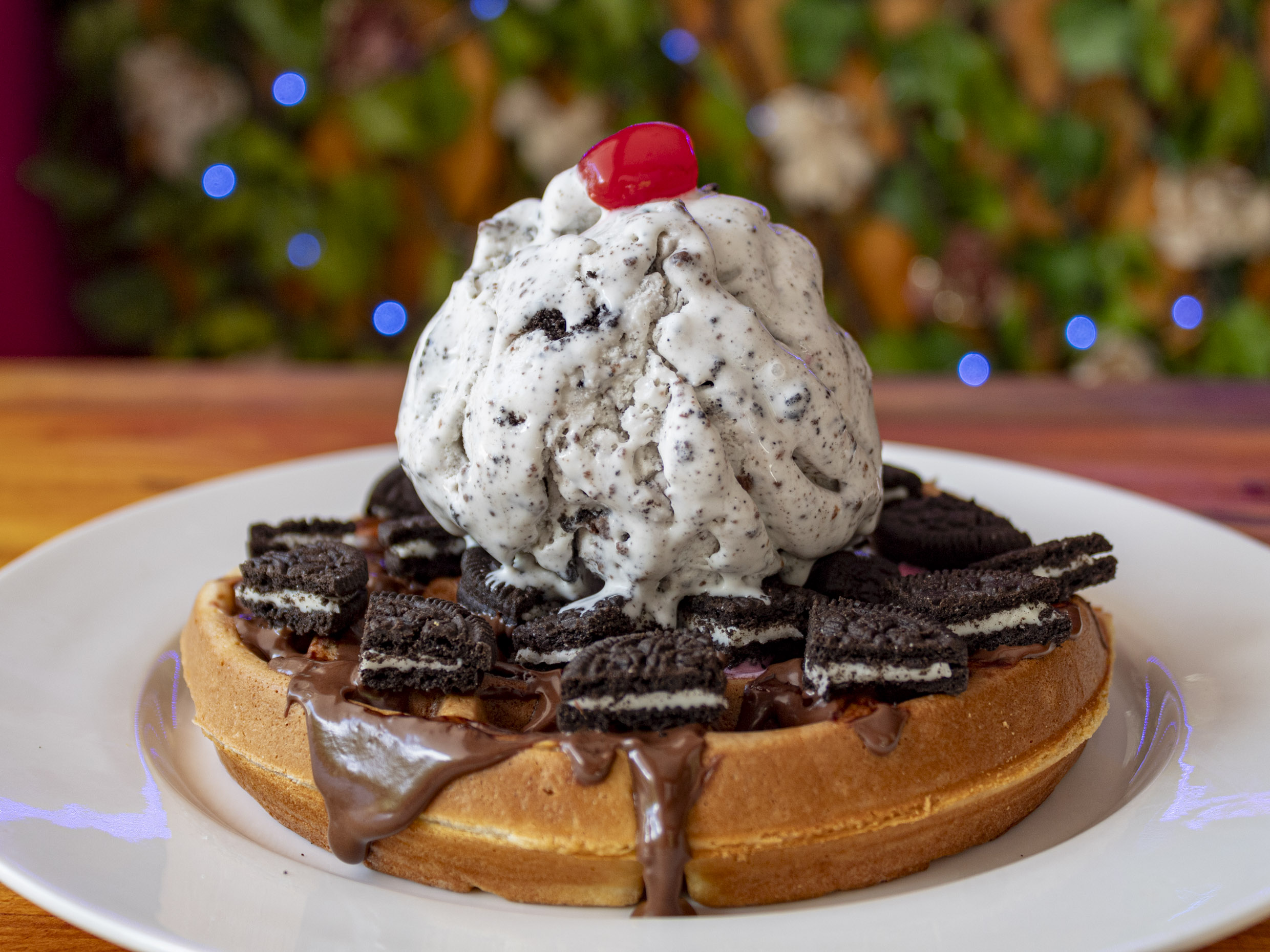 2 bolas de helados, galletas oreo, crema de la casa, cereza y salsa hershey