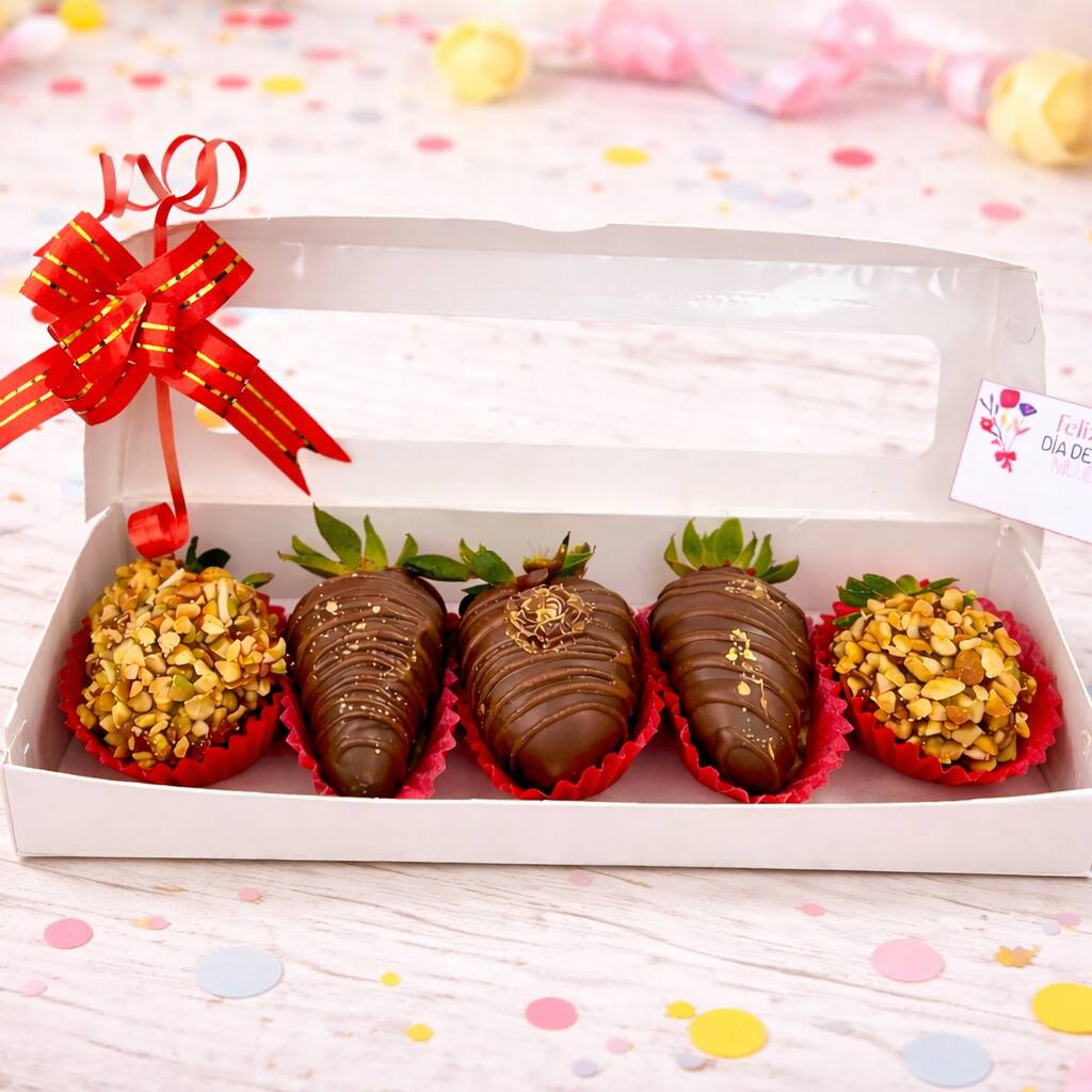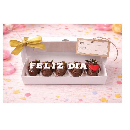Fresas cubiertas con chocolate , decoradas con fondant feliz día,presentada en una caja elegante con lazo y tarjeta, el detalle perfecto para sorprender.