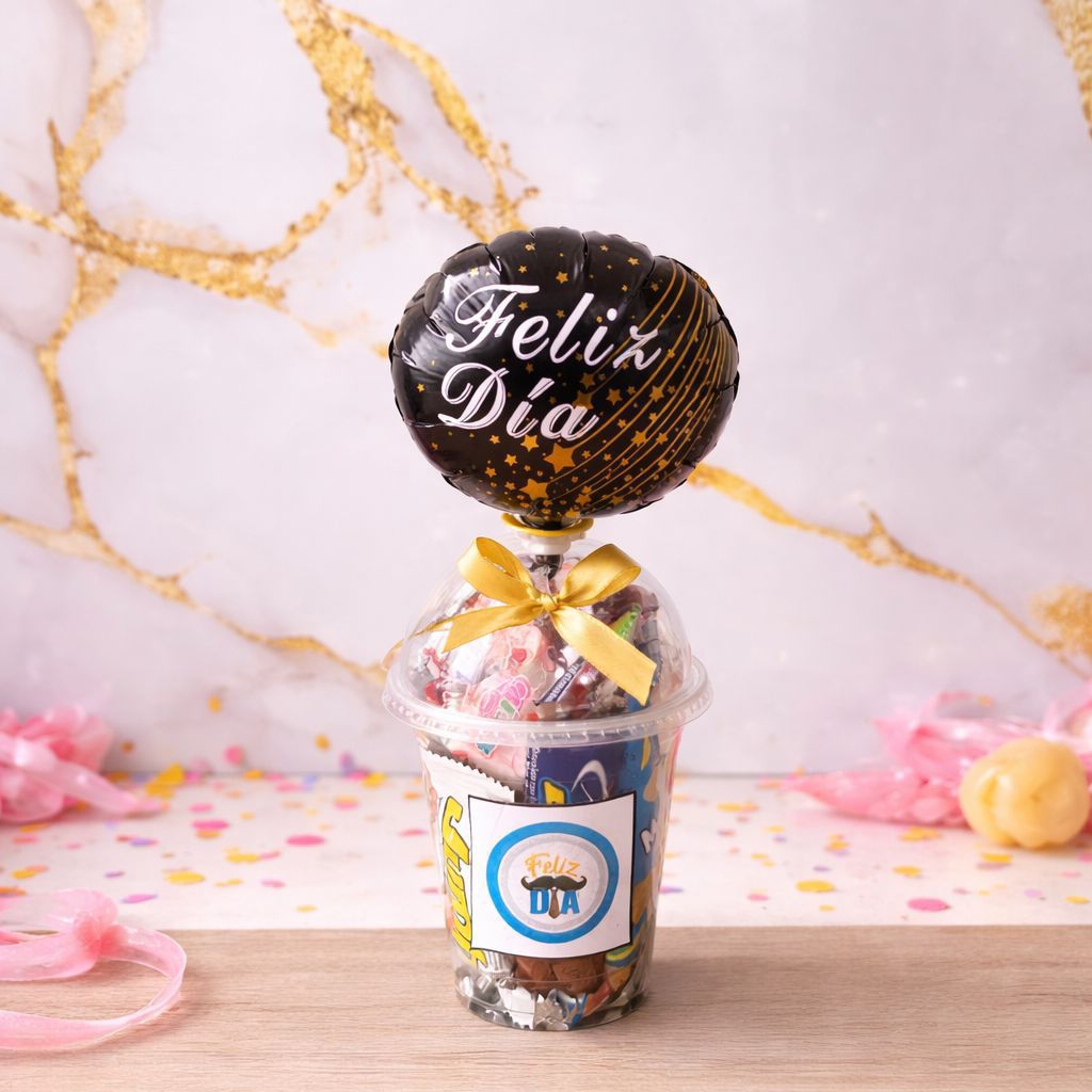 Un detalle perfecto para sorprender en cualquier ocasión incluye, vaso decorativo,topper feliz día,chocolatina jet, galleta wafer,jumbo mami, barrilete, masmelos,chocobread,bombombum,mani.lazo y tarjeta De/Para.