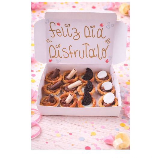 Delicioso mini brownies x9 decorados con toppings, en su caja con lazo y tarjeta.