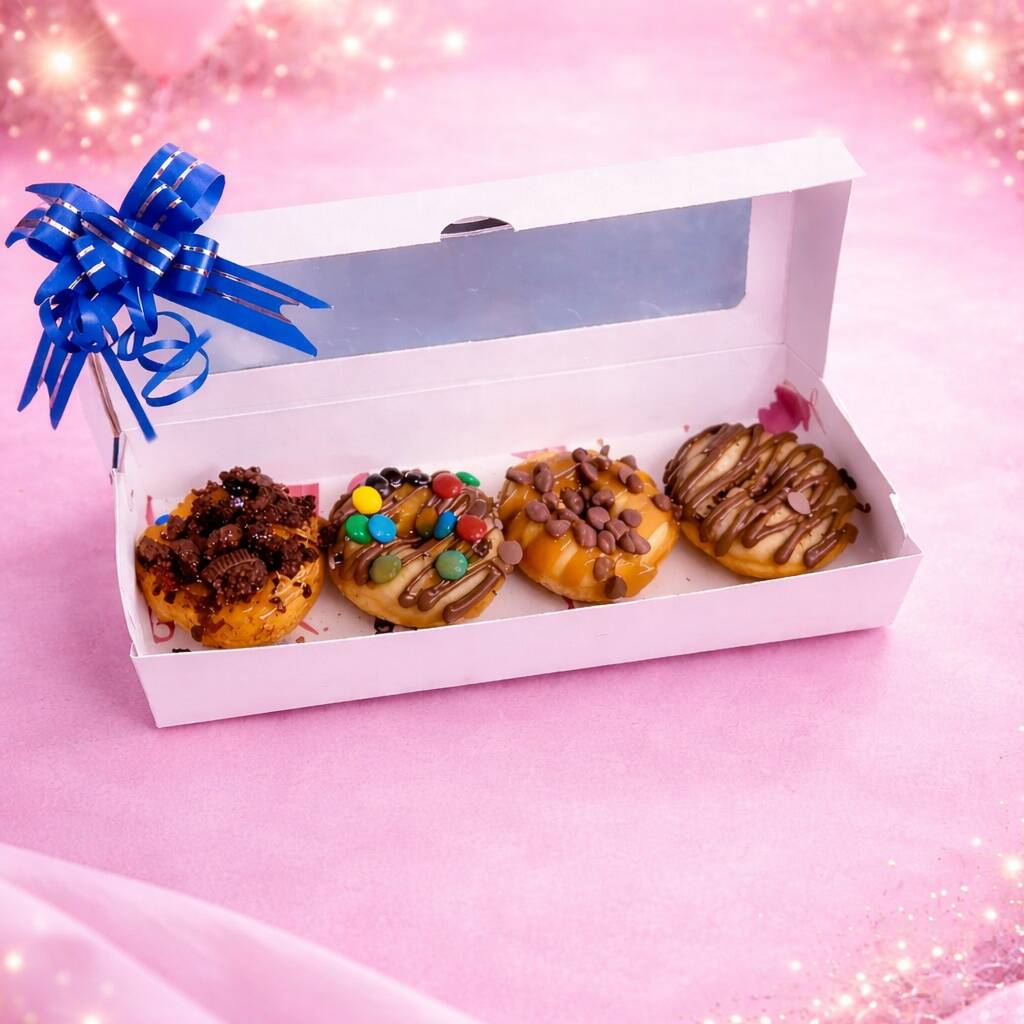 Deliciosas mini donas 4 unidades decoradas con salsa de arequipe y Nutella con toppings de oreo, mini chocolates de colores, chips de chocolate, con su lazo y tarjeta.