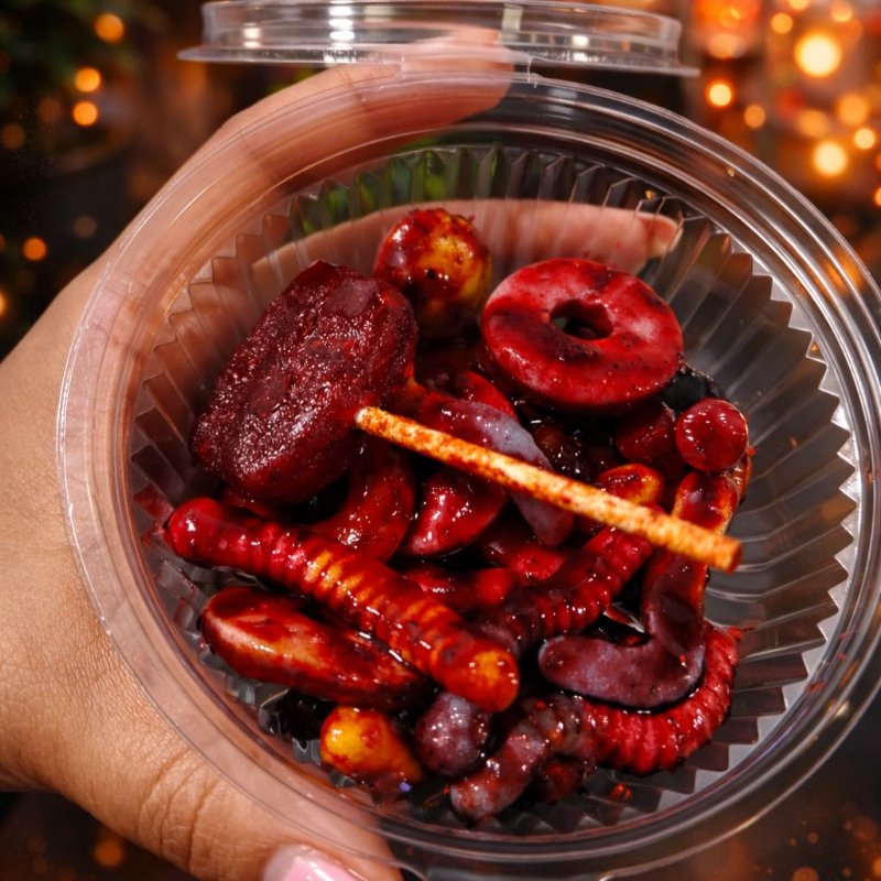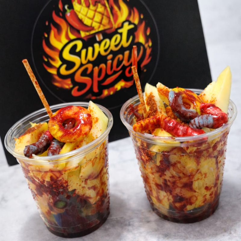 250 gr de gomitas enchiladas, mango en trozos con tajin y limon, manzana verde cubierta con tajin, pimienta y limon, takis enchilados mas adicional 2 chupetas muy picante.