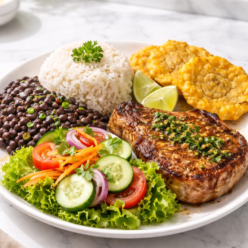 Sopa del día, 120grs de chuleta de cerdo asada, arroz, granos, ensalada, patacón y bebida
