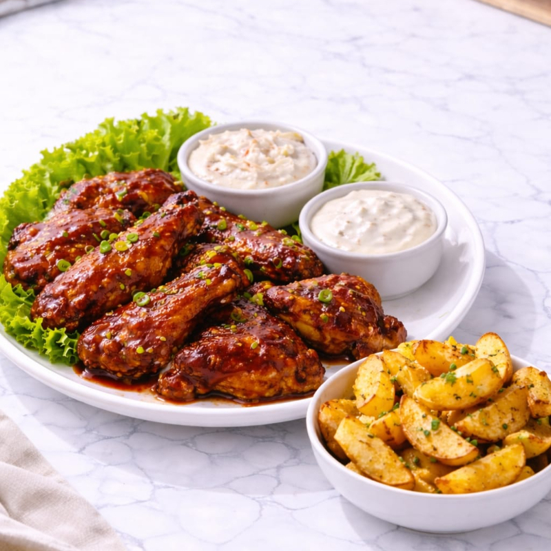 5 Alitas Fritas bañadas en salsa BBQ, acompañada de cascos de papas sasonadas.
