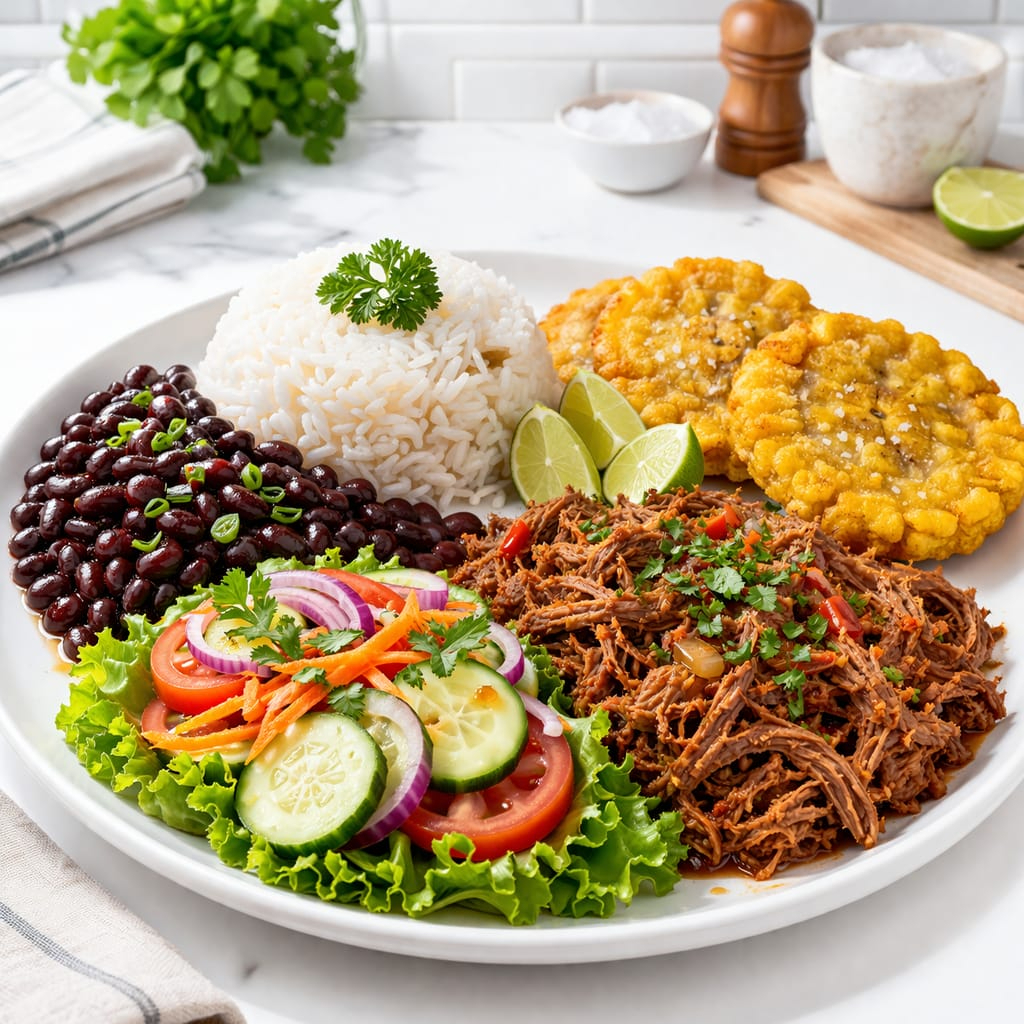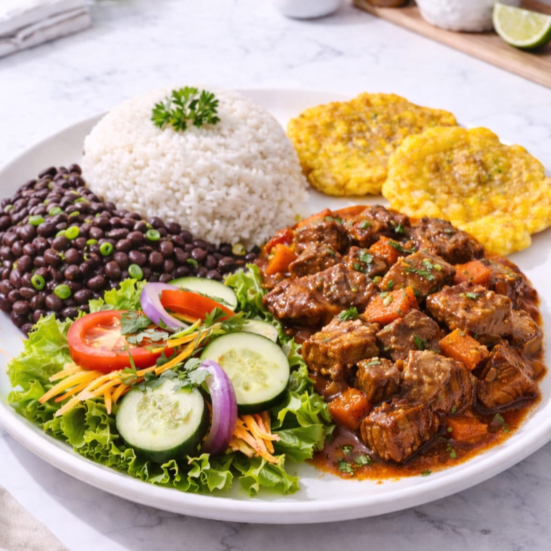 Sopa del día, 120grs de carne desmechada, arroz, granos, ensalada, patacón y bebida