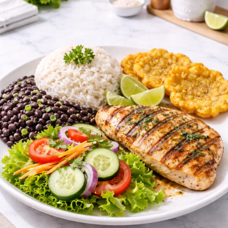 Sopa del día, 120grs de pechuga asada, arroz, granos, ensalada, patacón y bebida