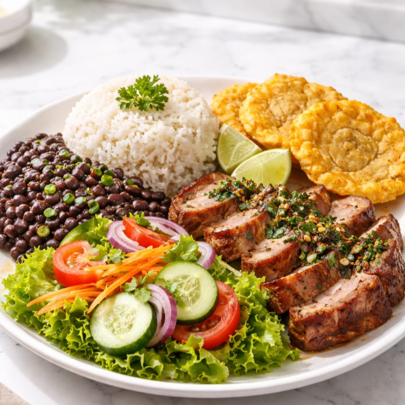 Sopa del día, 120grs de lomo de cerdo asado, arroz, granos, ensalada, patacón y bebida