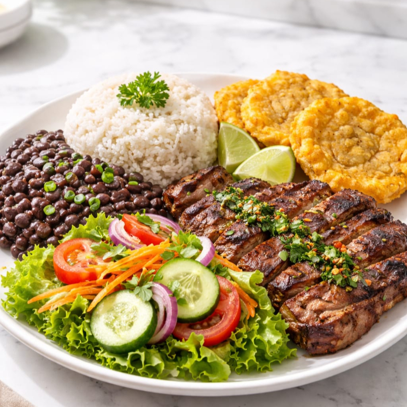 Sopa del día, 120grs de carne asada, arroz, granos, ensalada, patacón y bebida