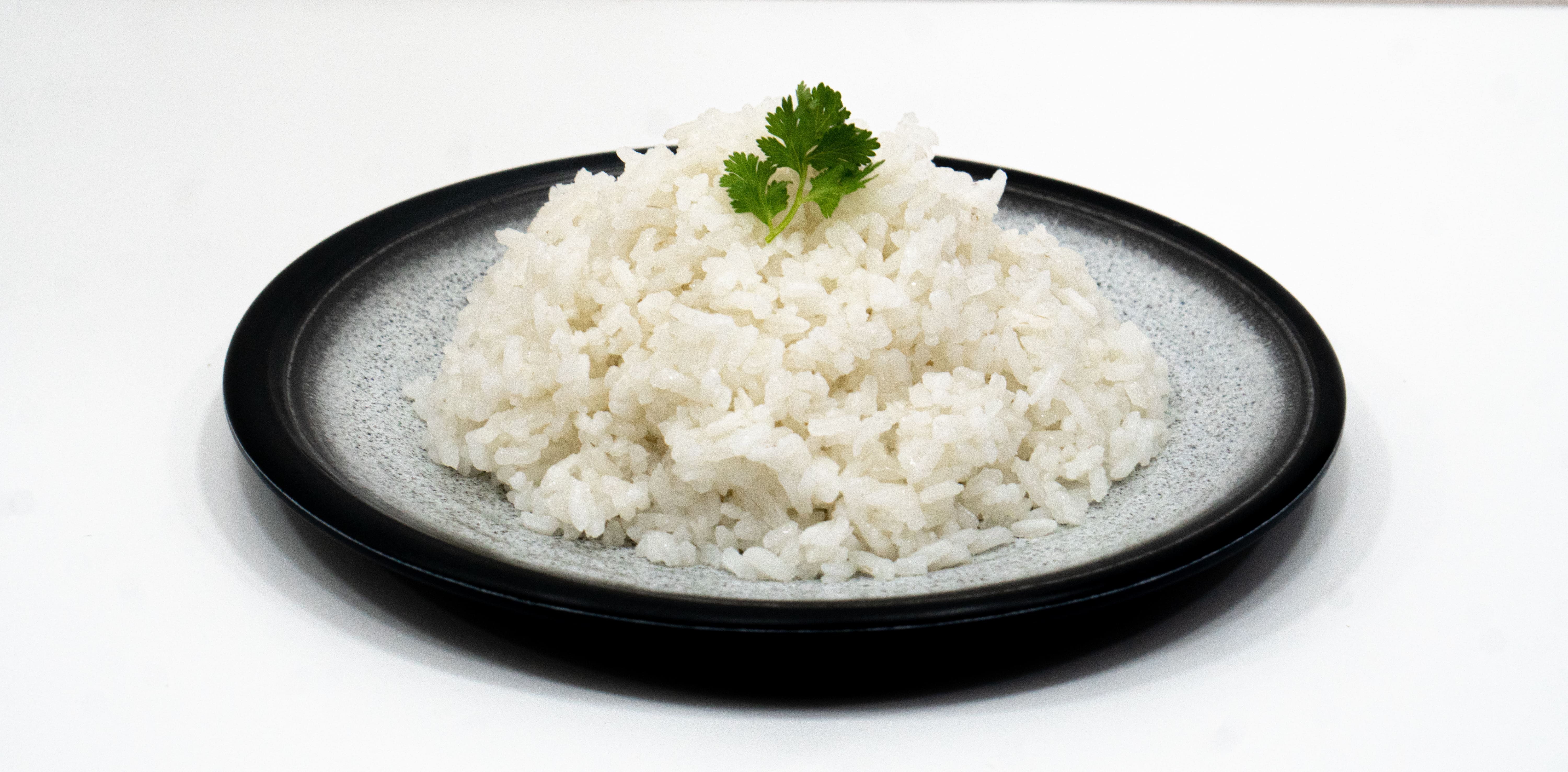 Acompañado de arroz de coco, ensalada verde y bebida.