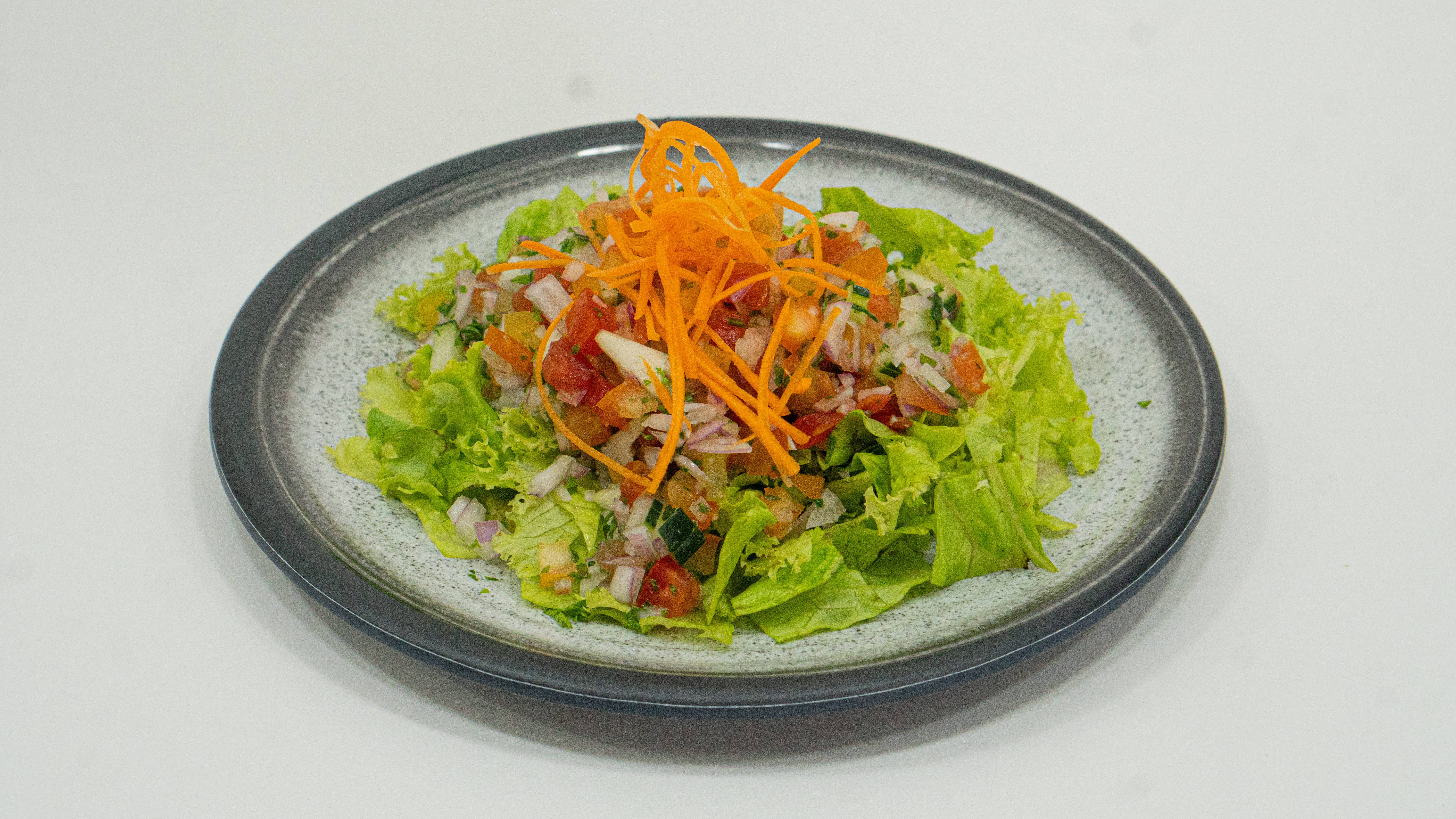 Porción de ensalada con zanahoria, cebolla, pepino, lechuga, tomate y vinagreta.