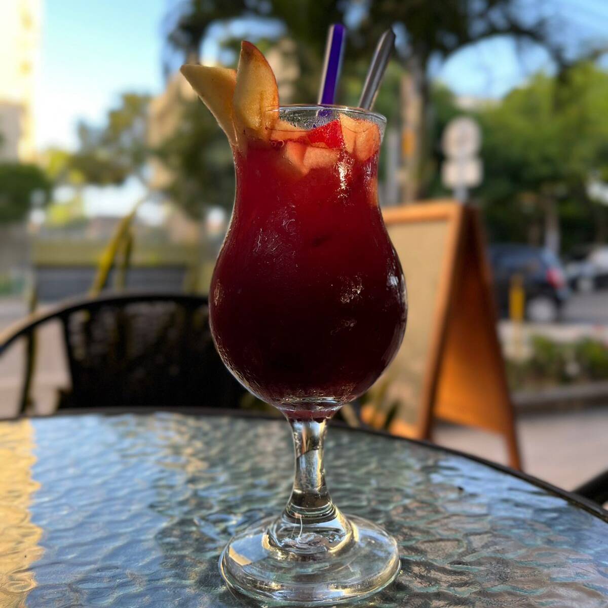 Refrescante soda a base de almíbar de la casa hecho de frutos rojos (mora, fresa y cereza), preparada con soda hatsu de frambuesa y rosas, acompañada de manzana roja picada.