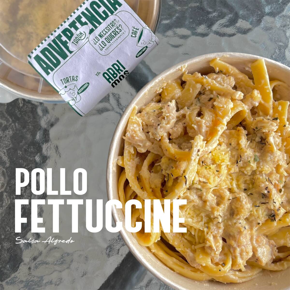 Pasta en cremosa salsa bechamel, finas hiervas, queso parmesano acompañada con trozos de pollo salpimentado.