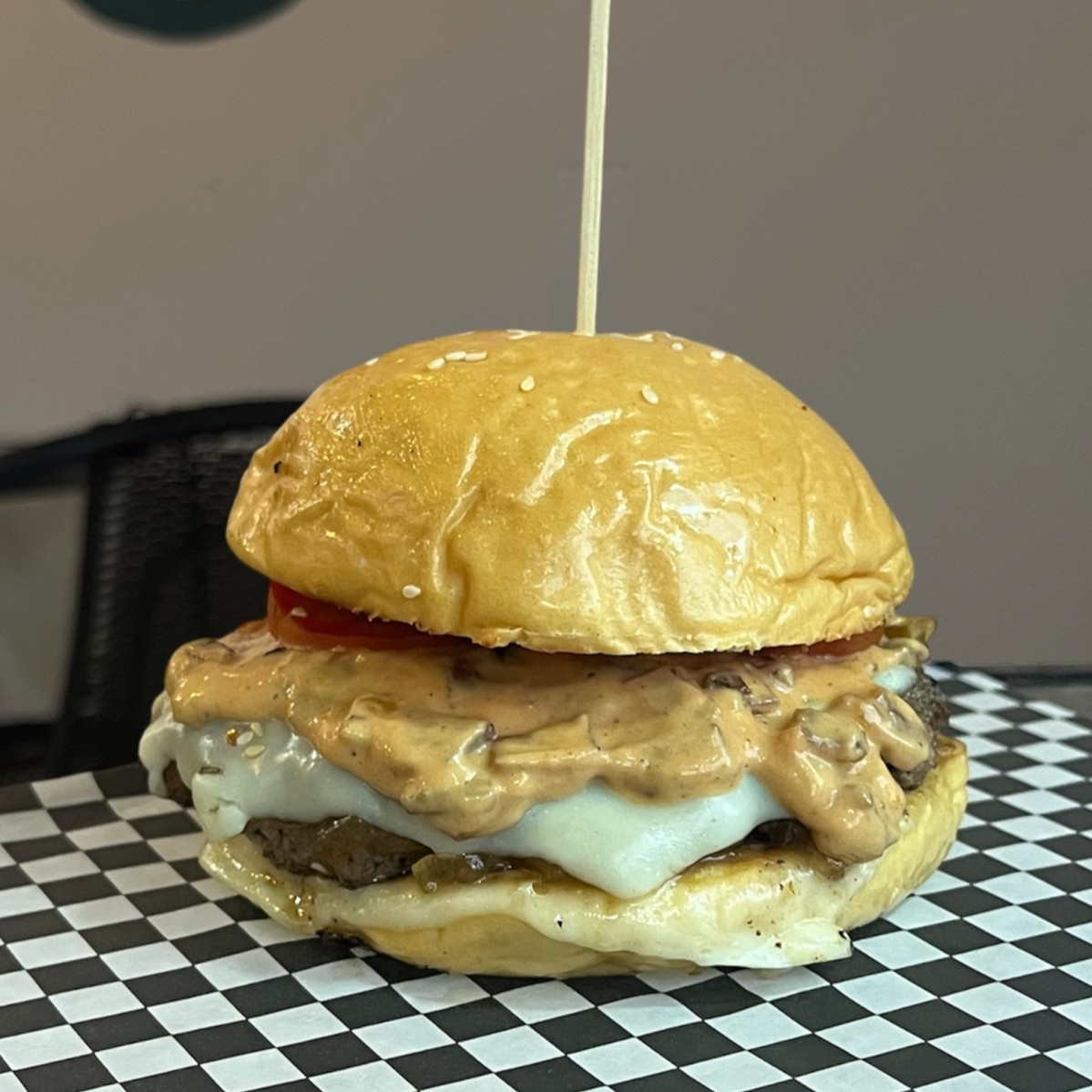 Hamburguesa con 150gr de carne salpimentada, cebolla caramelizada, tocineta, doble queso mozarella, salsa signature (mayonesa, ketchu, mostaza y especias).