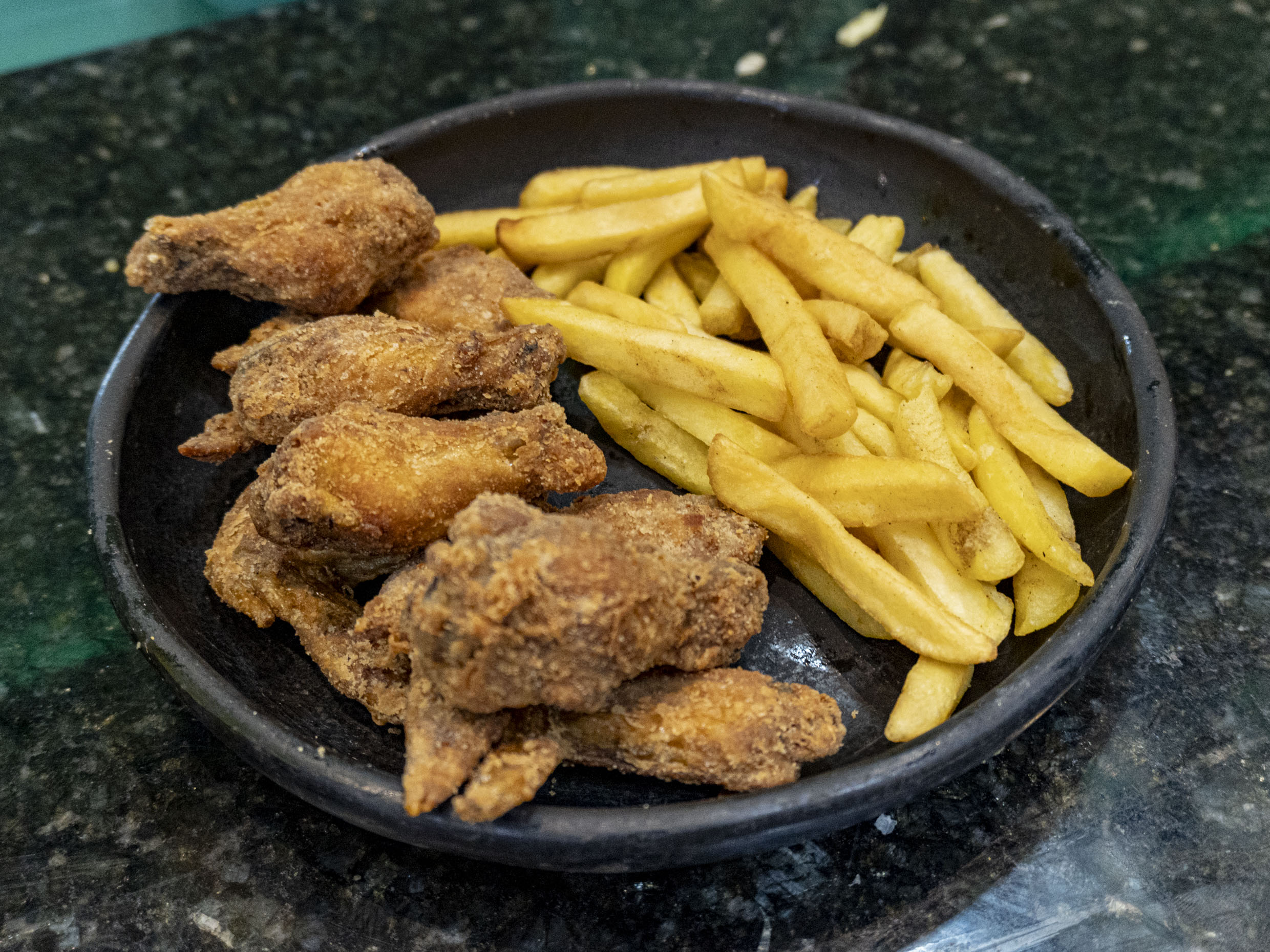 Deliciosas alitas apanadas x8 und y bañadas en salsa de tu elección, acompañadas de papa a la francesa.