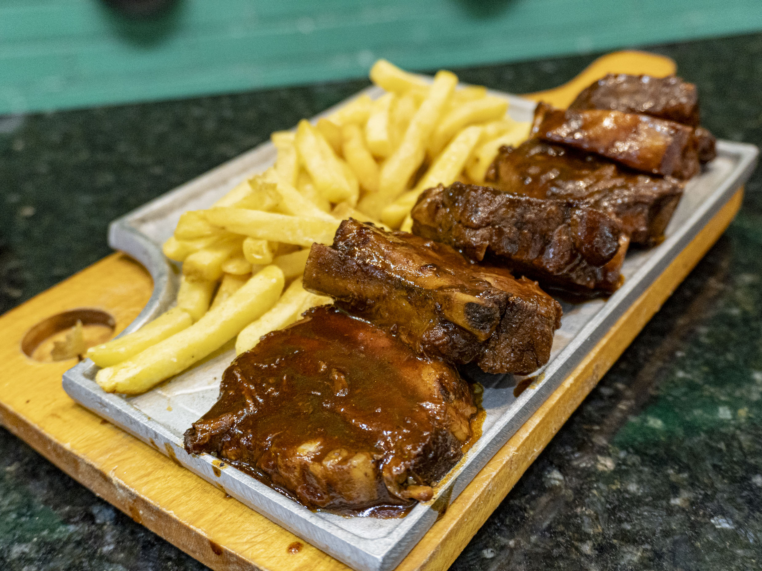 500 gramos Costillas carnudas de cerdo en cocción por 4 horas en salsa BBQ, acompañada de papa a las francesa.