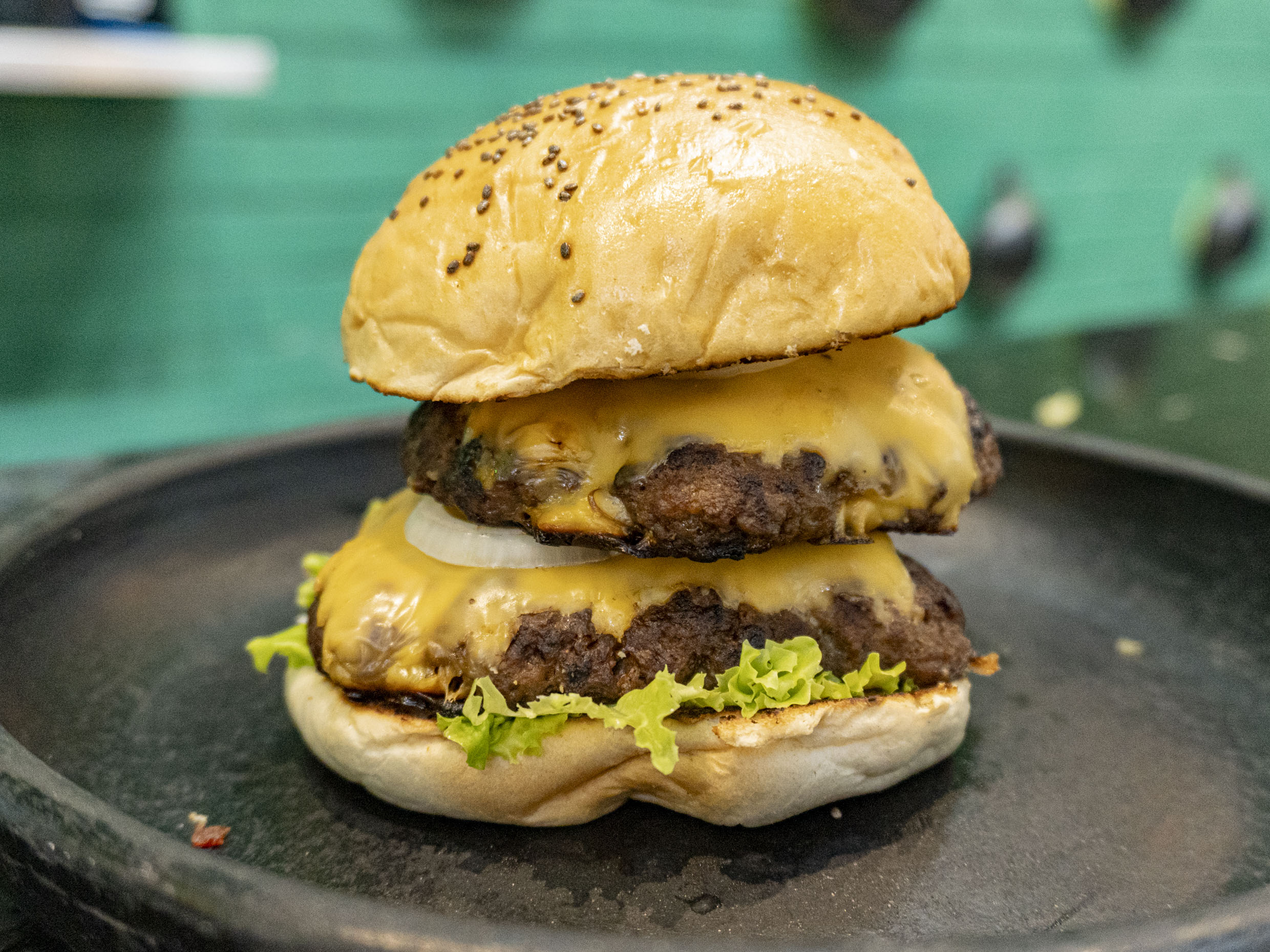 DOBLE Carne de res (300 gr), Pan Brioche, DOBLE tocineta premium, DOBLE queso cheddar, lechuga romana, salsa de la casa, acompañada de papas a la francesa.