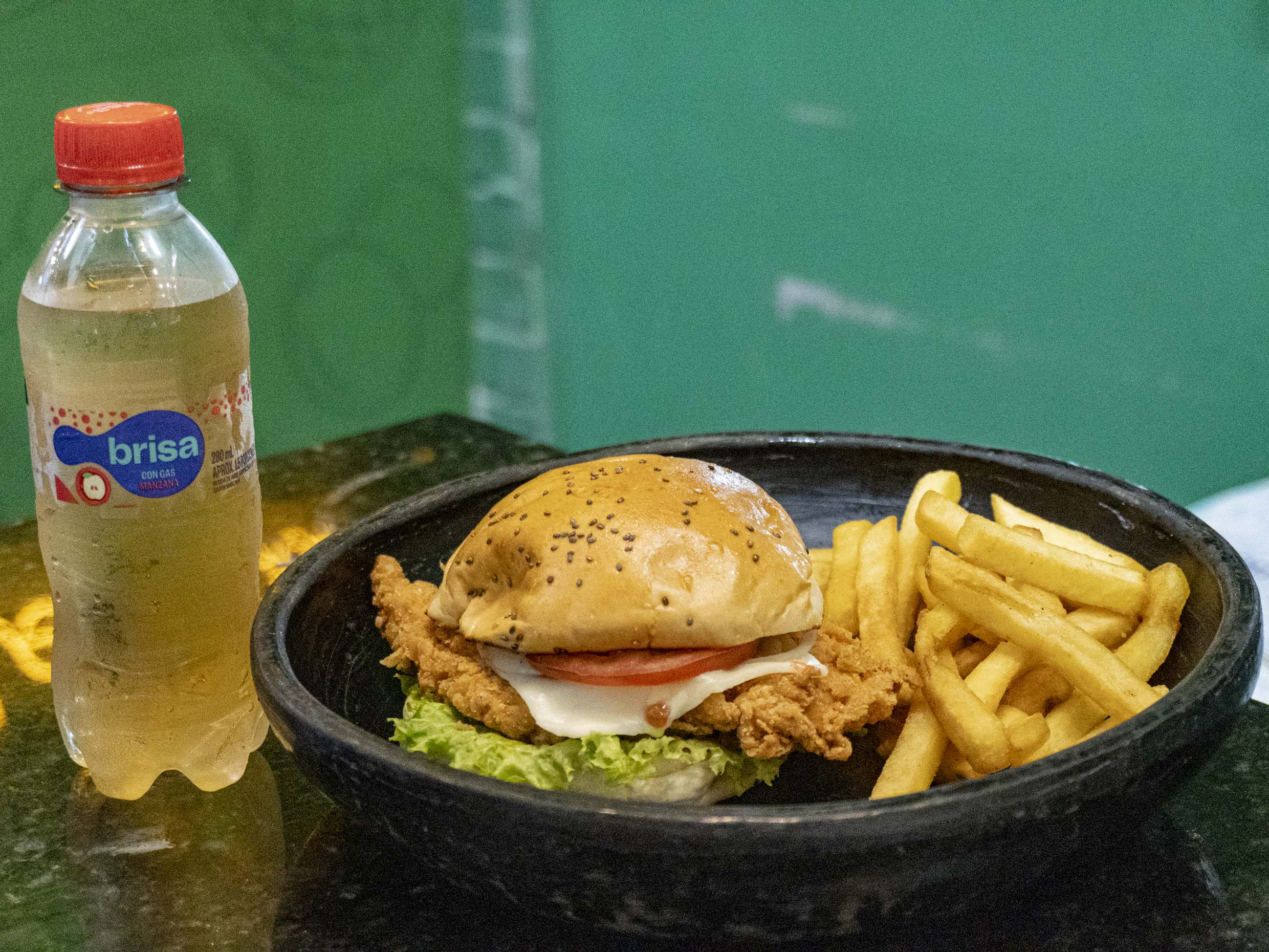 120 gr pechuga pollo apanada, pan brioche, lechuga romana, cebolla, tomate, queso mozarella, salsa de la casa, con papas a la francesa y bebida de 250 ml.