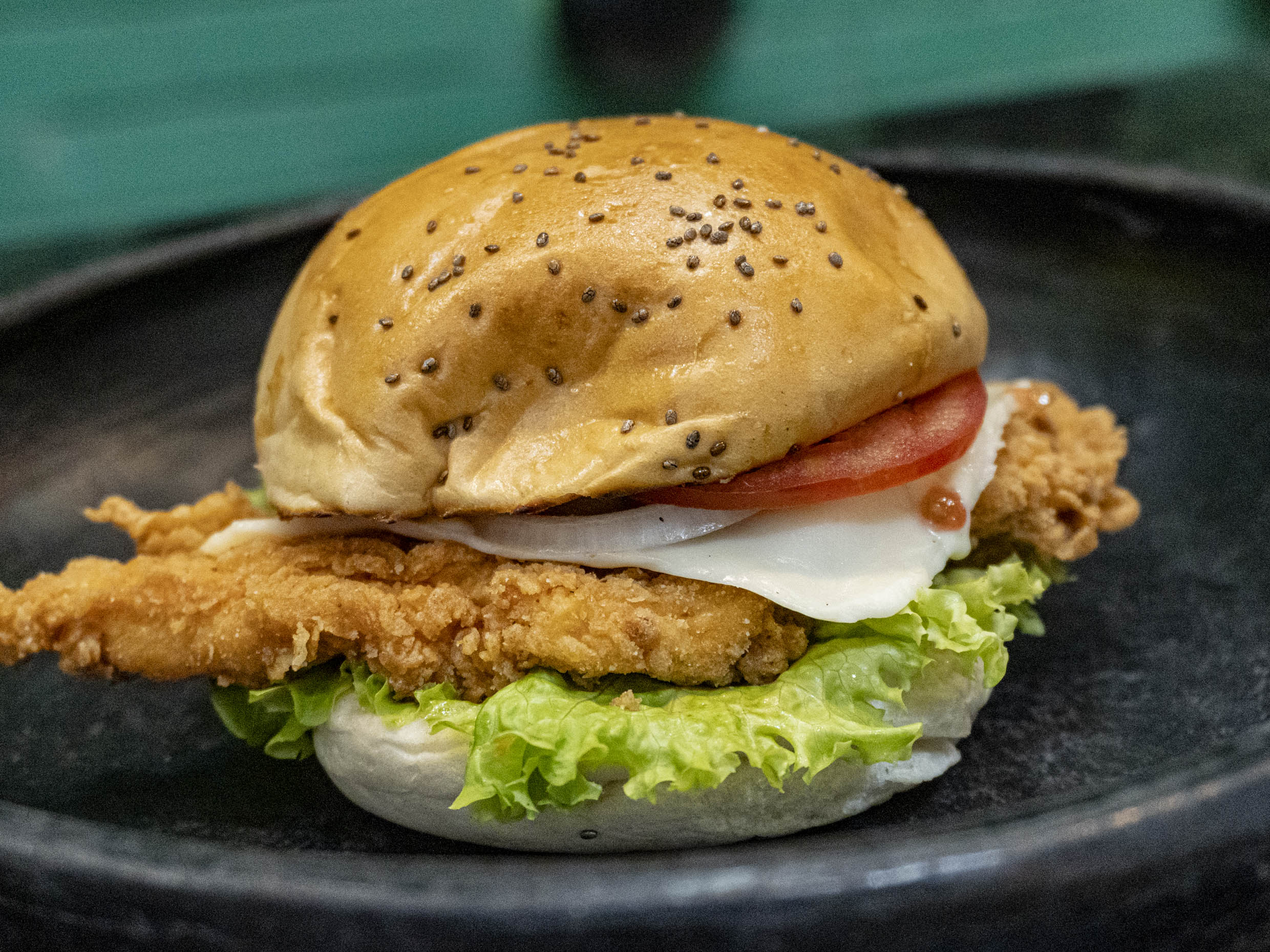 120 gr pechuga pollo apanada, pan brioche, lechuga romana, cebolla, tomate milano, queso cheddar, salsa de la casa. acompañada de papas a la francesa.