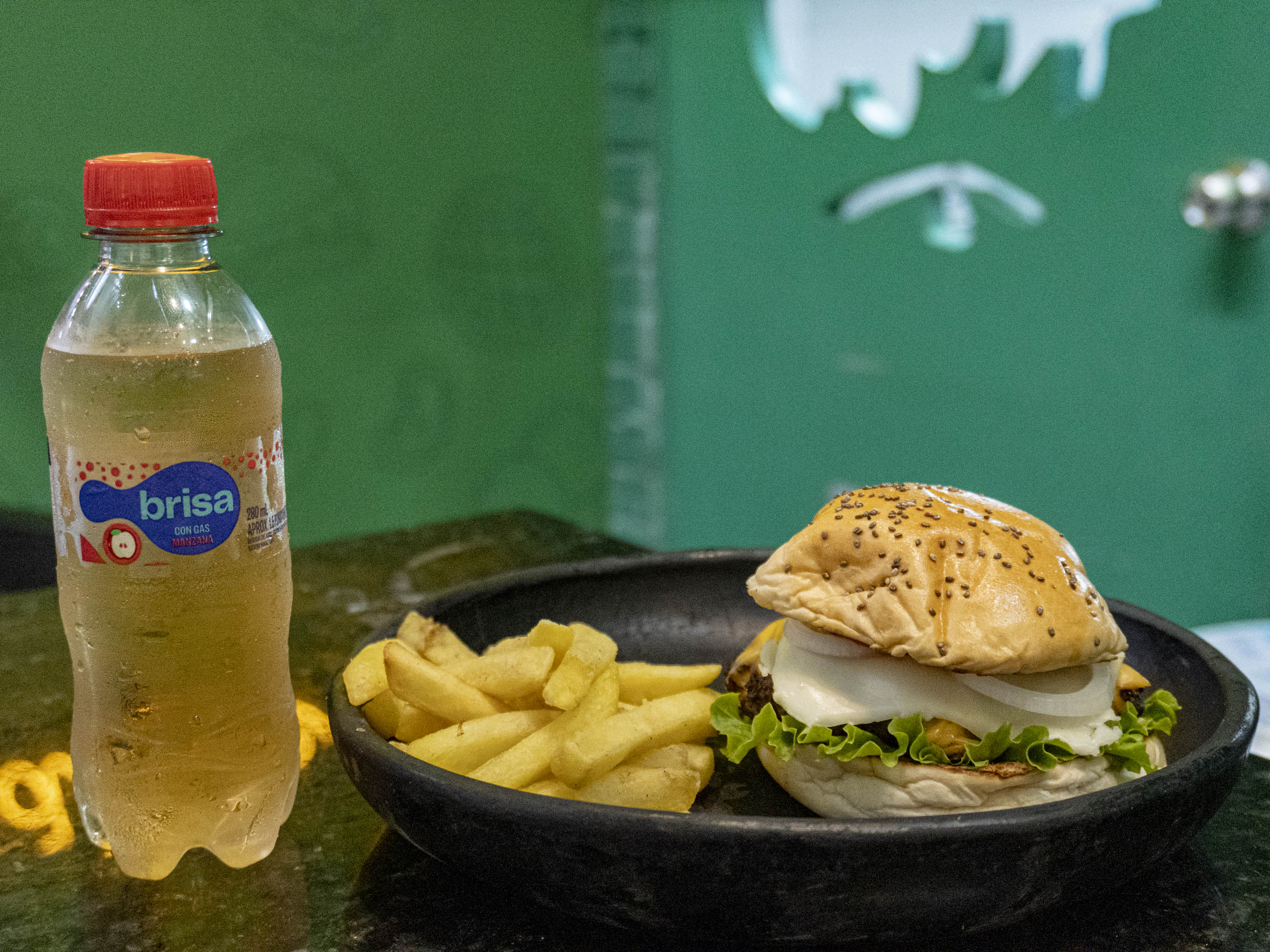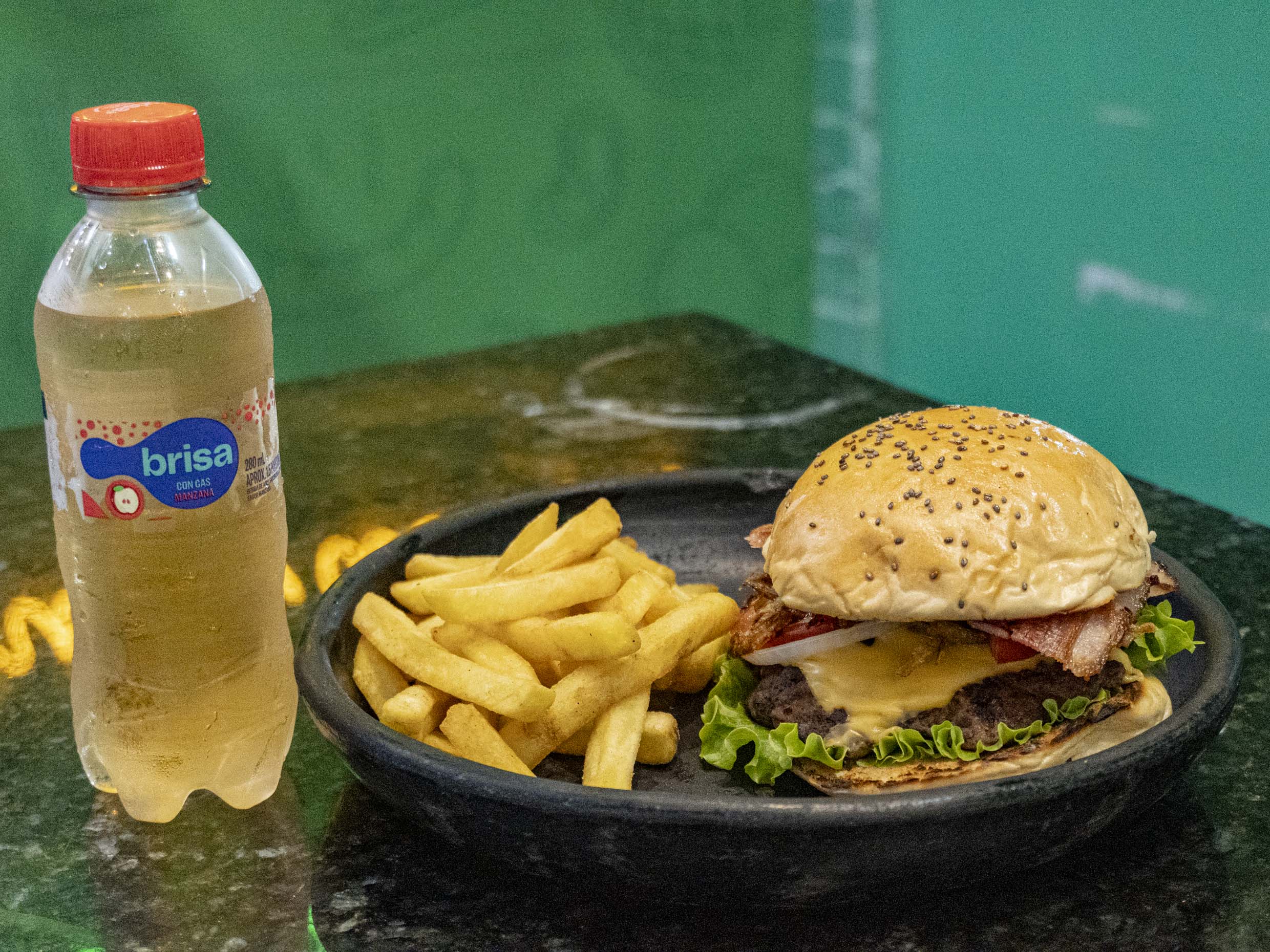 150 gr de carne de res, pan brioche, lechuga romana, cebolla, tomate, queso cheddar, salsa de la casa, con papas a la francesa y bebida de 250 ml.