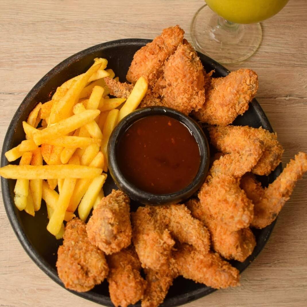 Deliciosas alitas apanadas x8 und y bañadas en salsa de tu elección, acompañadas de papa a la francesa.