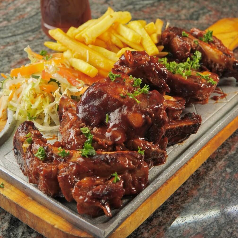 500 gramos Costillas carnudas de cerdo en cocción por 4 horas en salsa BBQ, acompañada de papa a las francesa.