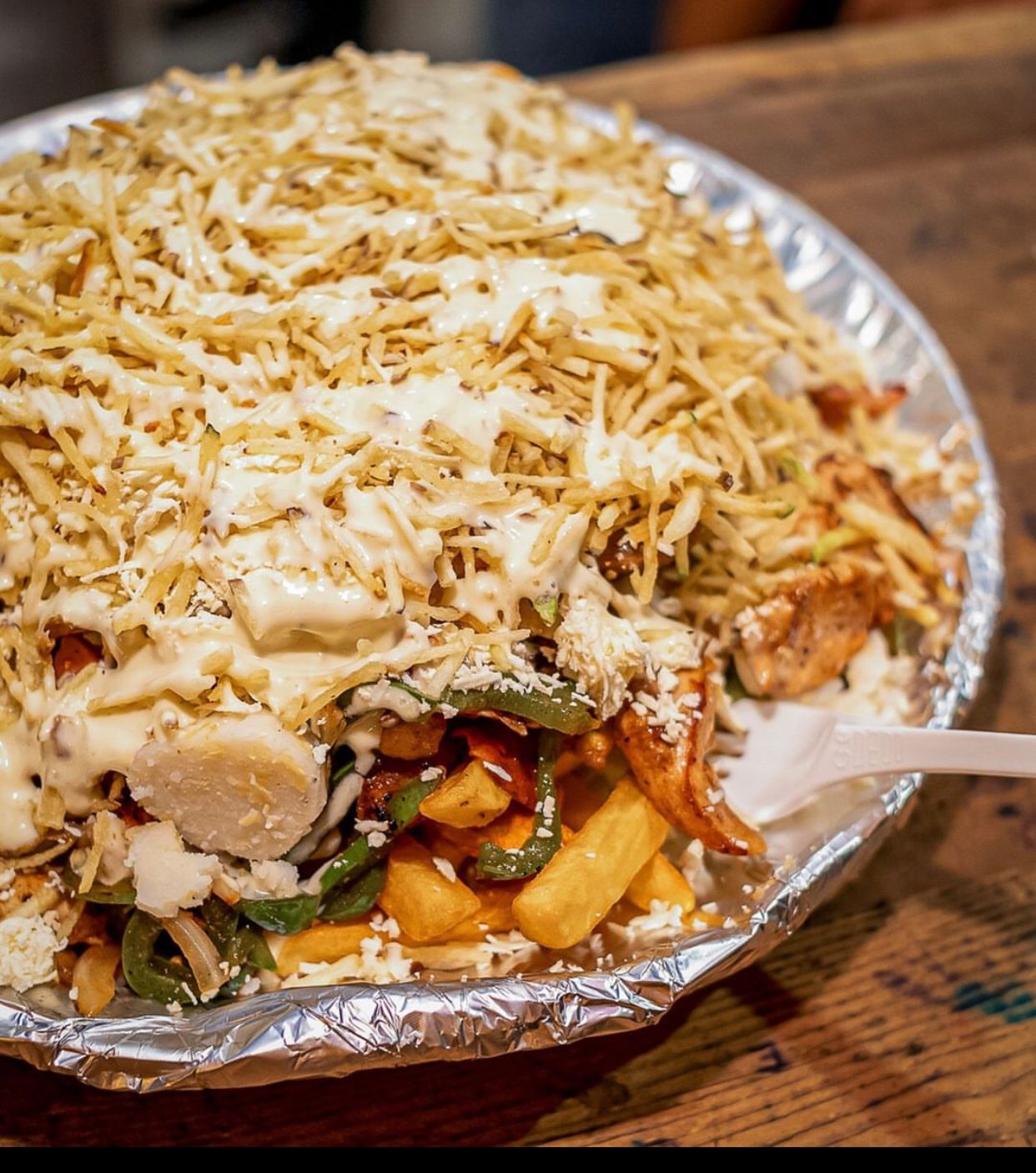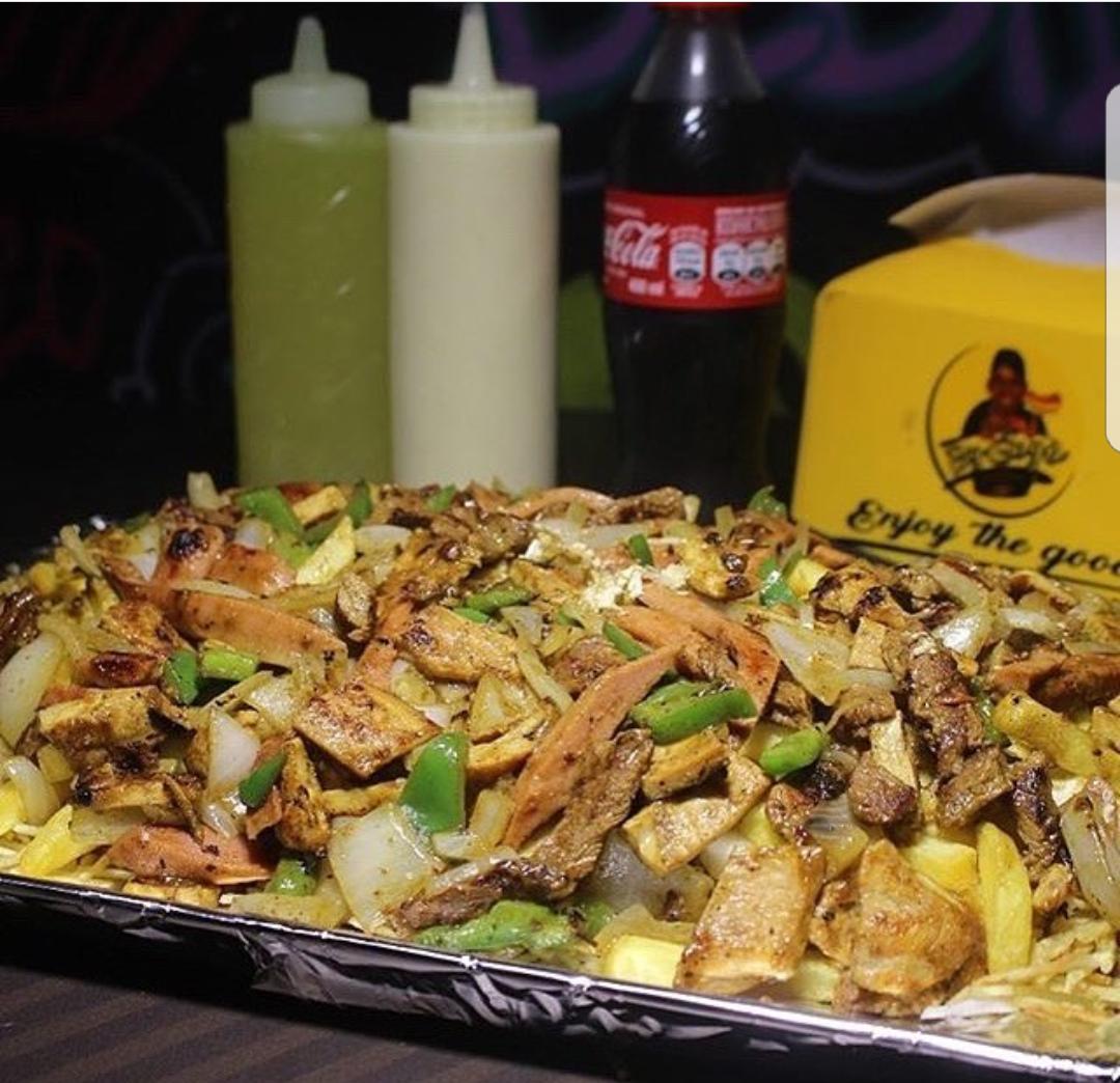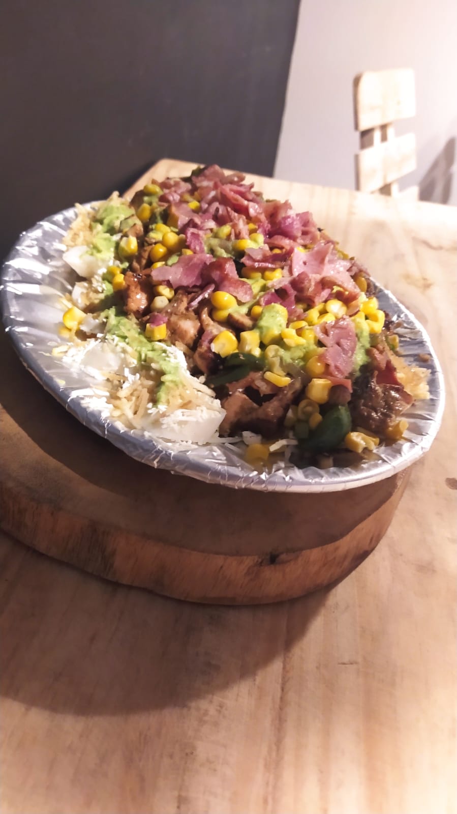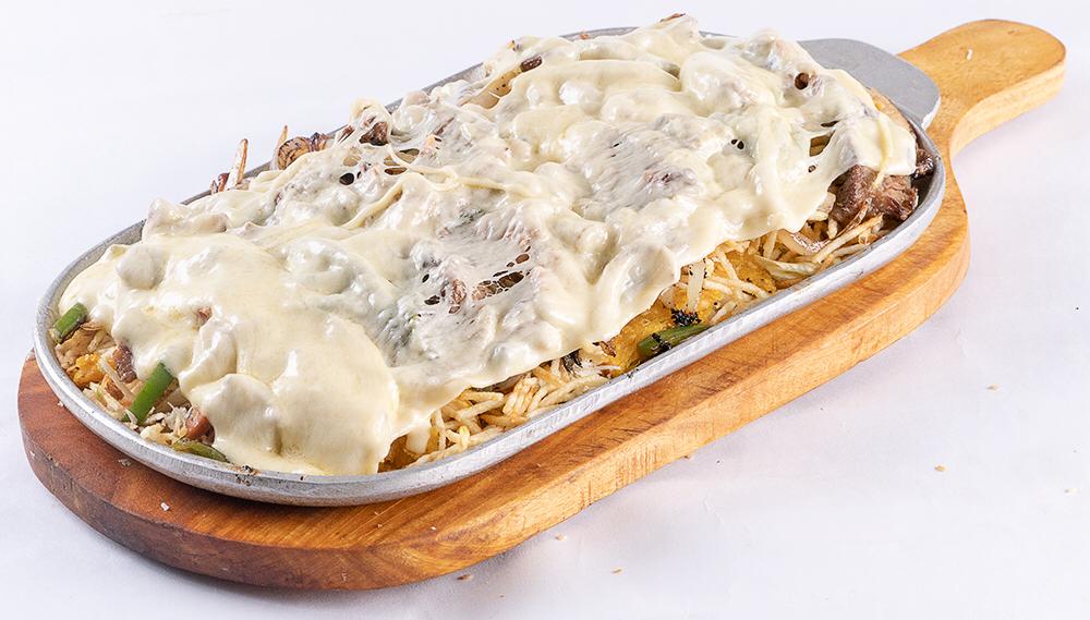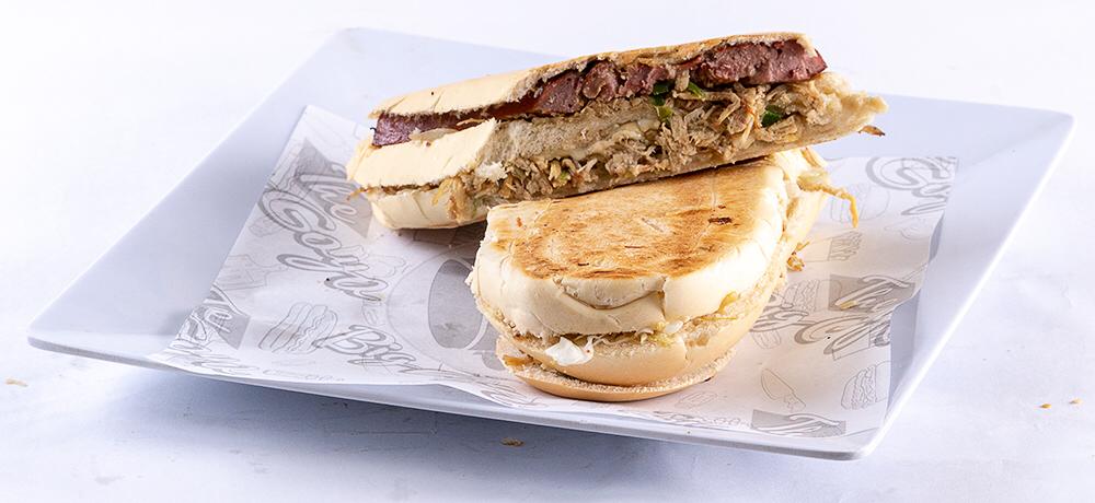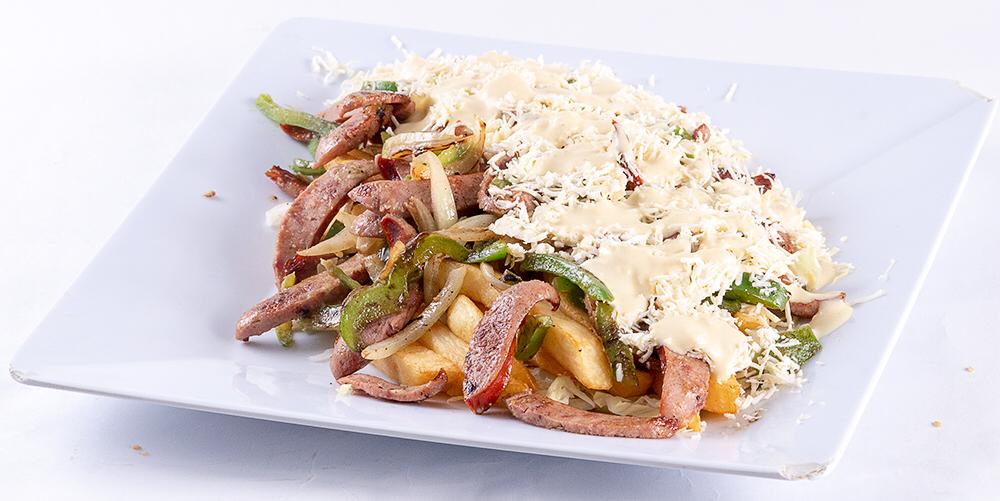 Pollo, Carne, Chorizo y Butifarra,lechuga,queso costeño,papita chongo,salsa tartara,queso Mozarella, Fundido