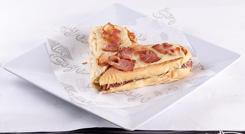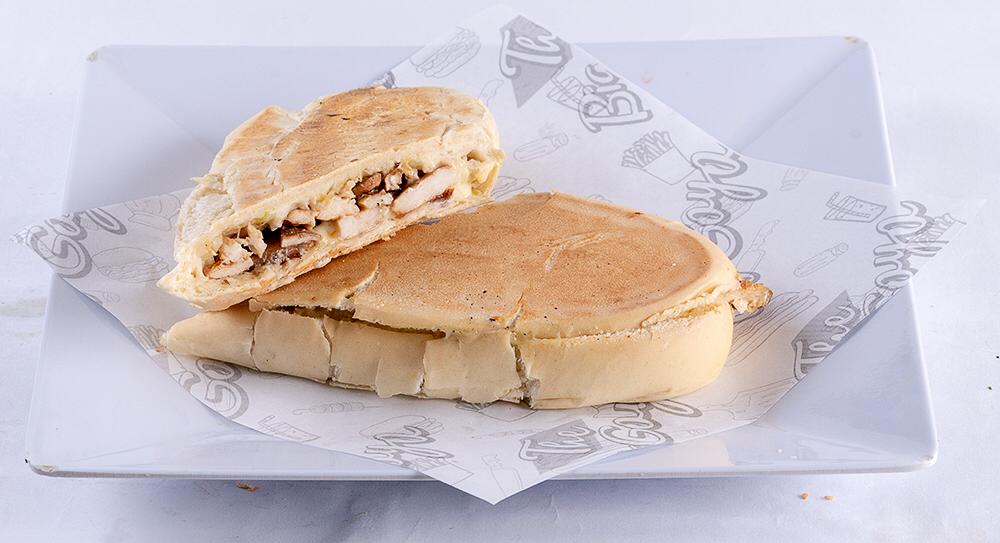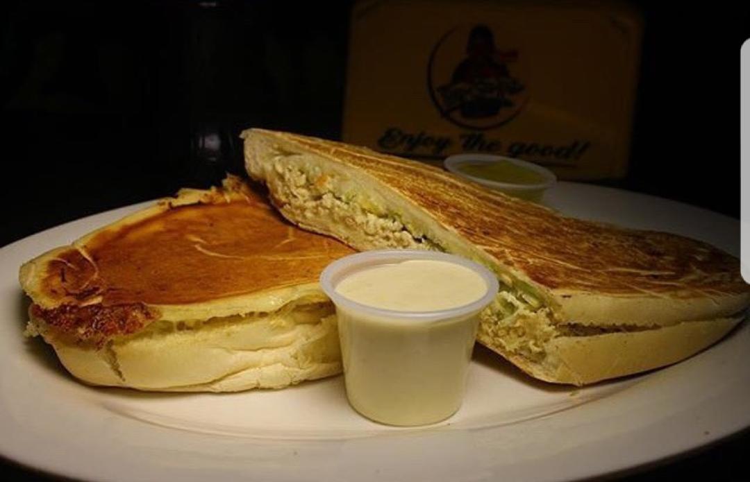Platillo individual: Pan francés a la plancha con lechuga, cebolla, pollo desmenuzado, queso mozzarella y salsa tártara.